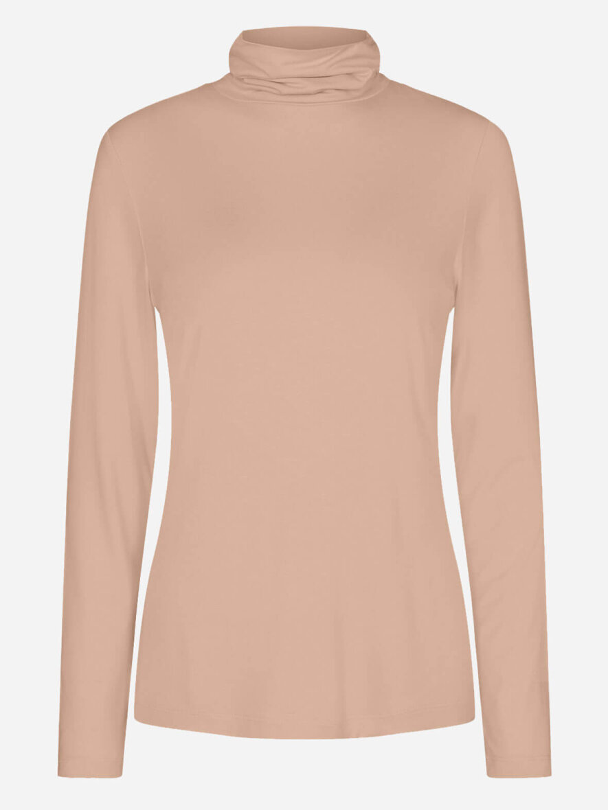 Blød og lækker bluse fra Soyaconcept med høj krave. Blusen har lange ærmer og sidder tæt til kroppen. Kan evt. styles under en kjole. Max 5% krymp.