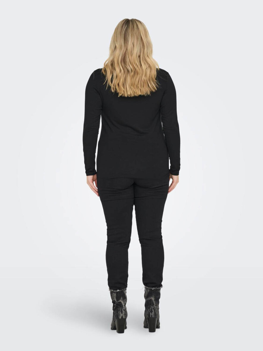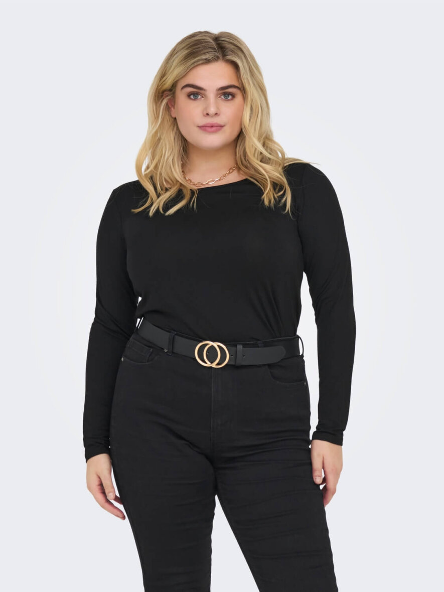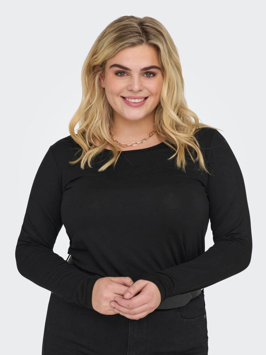 Dejlig blød bluse i sort fra ONLY Carmakoma med masser af stræk. Rund hals og lange ærmer. Brug den under en vest eller en tynd strik cardigan.
