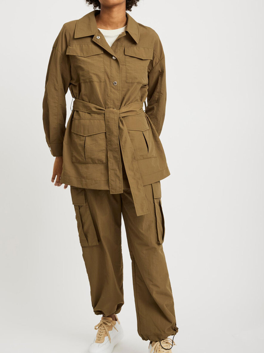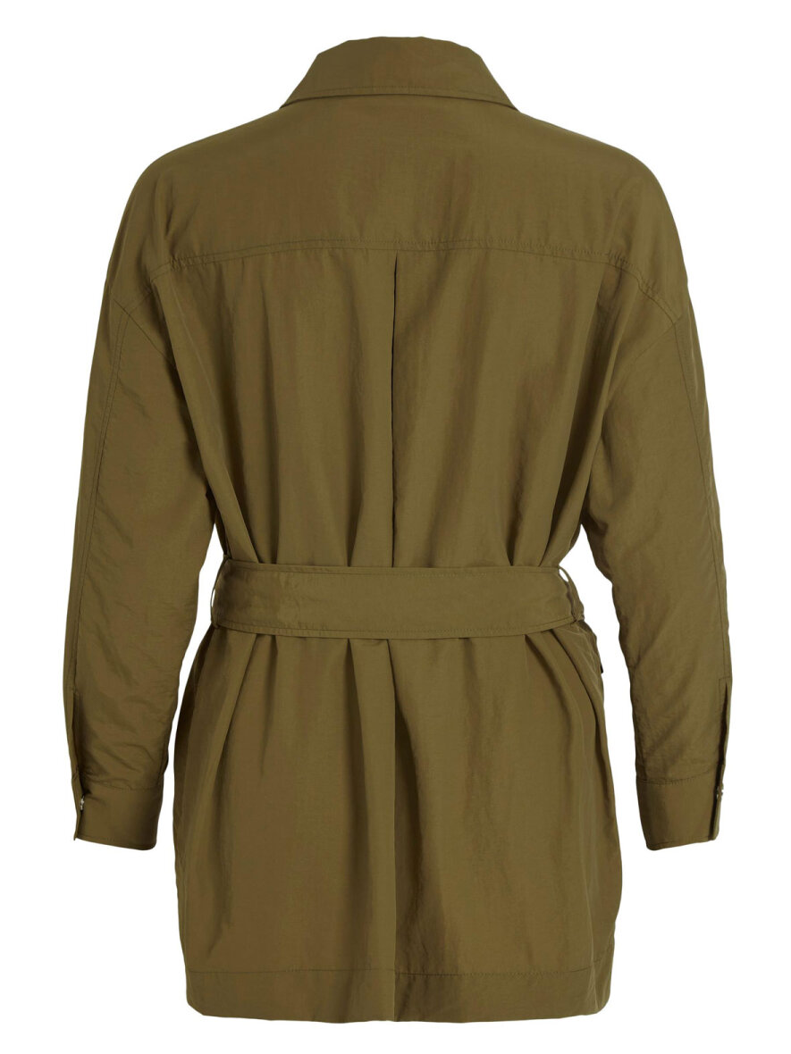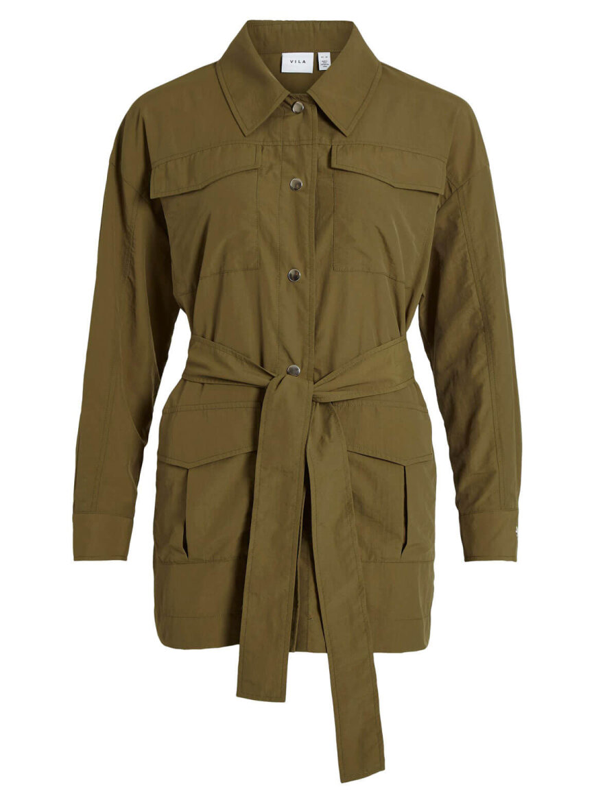 Super flot jakke i army fra VILA. Jakken har klassisk krave og lukkes med sølv trykknapper ned foran. Lange ærmer med manchetknapluk. To store brystlommer og to forlommer. Aftageligt bindebælte i taljen.