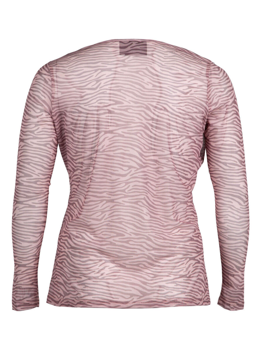 Lækker mesh bluse fra Zoey med rund hals og lange ærmer. Zebra print i rosa nuancer. God rummelighed, så vil du gerne have en bluse der sidder til, skal du gå et nummer ned i størrelse.