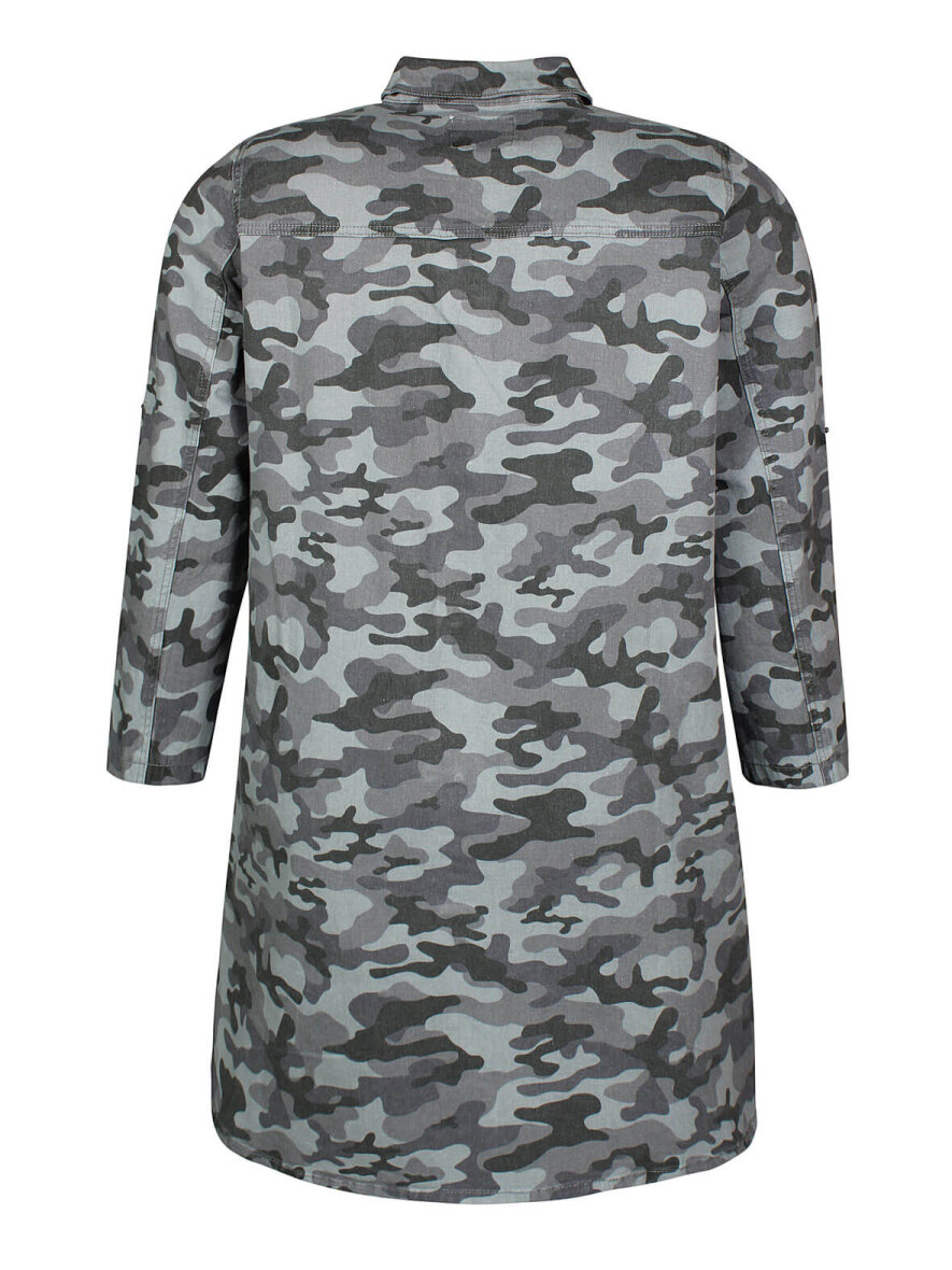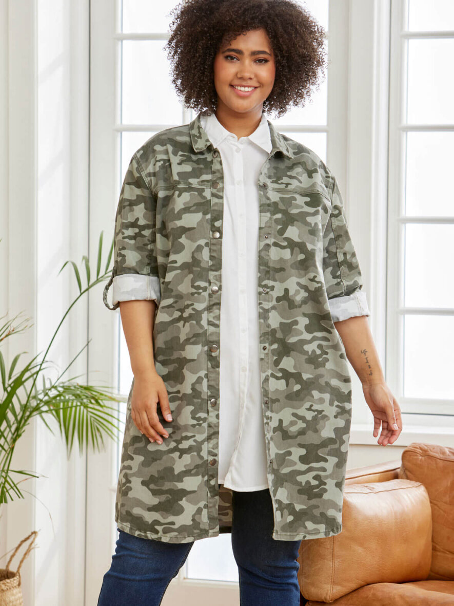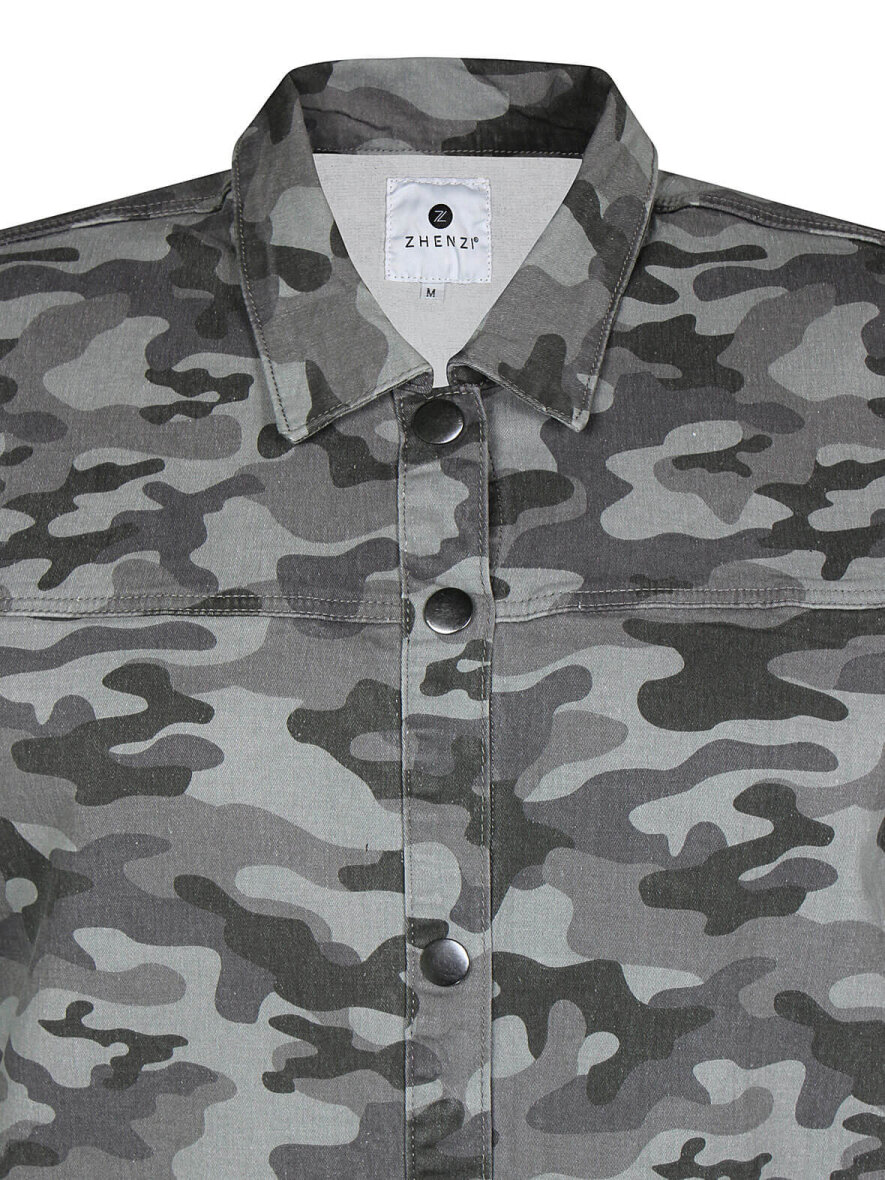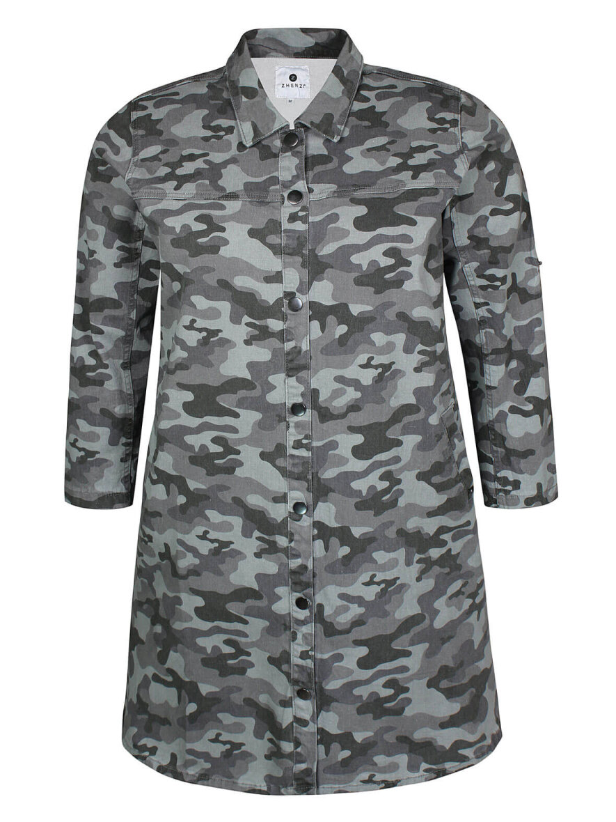 Cool jakke i camouflage fra Zhenzi i army-farver. Klassisk krave og gennemgående knapluk ned foran med metalliske knapper. Lommer i siderne. Mulighed for at sætte ærmerne op med trykknap. Let runding forneden og lille slids i siden.
