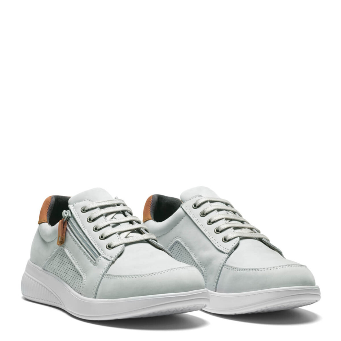 Komfortabel hvid sneaker fra New Feet. Skoen er lavet i hvid nubuck, med fine brune detaljer ved lynslåsen og hælen. Skoen reguleres med snørebånd over vristen, så skoen kan tilpasses til netop din fod. Ydermere er skoen med lynlås i siden, så man nemt kan komme i skoen, uden at skulle binde snørebånd op.