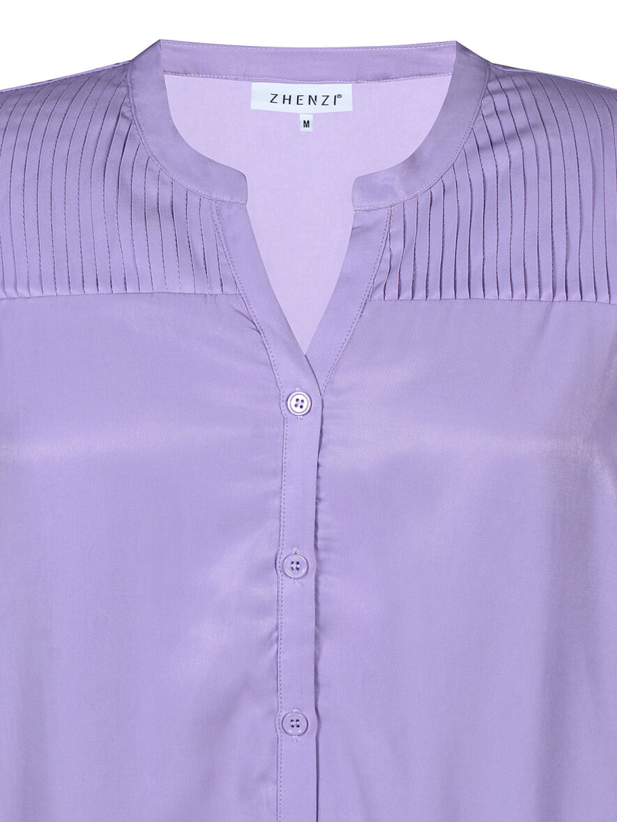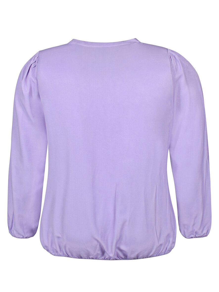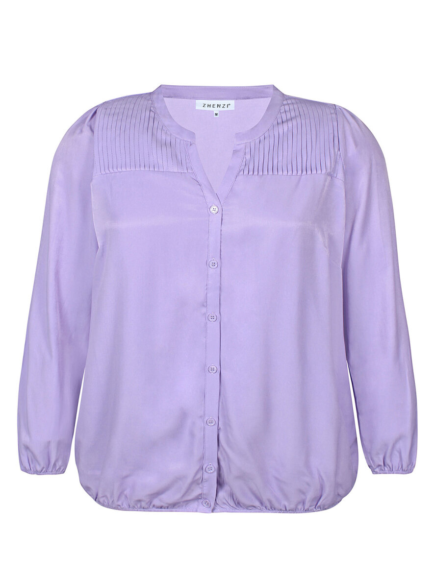 Flot bluse i blank materiale fra Zhenzi med rund hals der går ned i V-udskæring. Gennemgående knapluk ned foran. Lange pufærmer med elastikkant forneden. Små fine læg foran ved skuldrene. Elastikkant forneden på blusen.