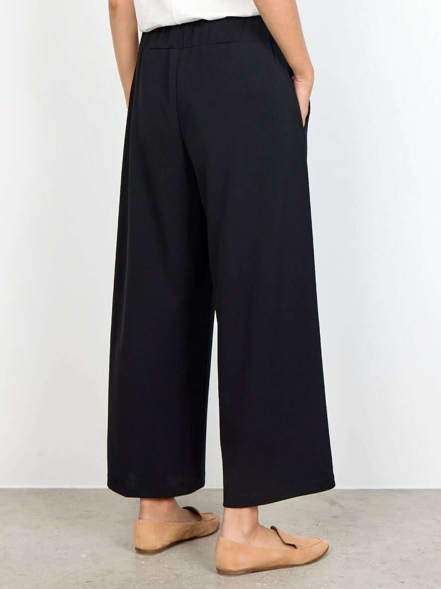 Lækre og komfortable bukser med vide ben fra Soyaconcept, som kommer i en genanvendt polyester og elasthan blanding. Elastik i taljen bagpå og fast talje foran. Lommer i siderne. Ankellængde.