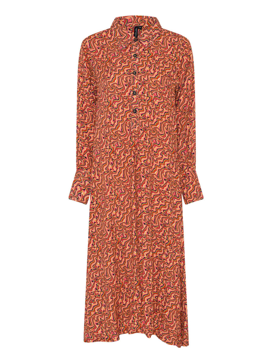 Super cool kjole fra Soulmate med psykedelisk print i orange mix. Klassisk krave og med stolpeluk ned foran med små knapper. Lange ærmer med bred manchetknapluk. Stiklommer i siderne. Max 5% krymp.