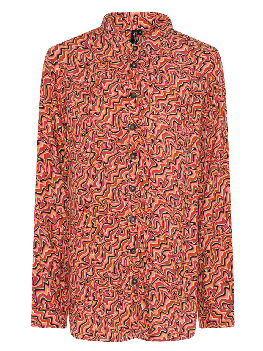 Super cool skjorte fra Soulmate med psykedelisk print i orange mix. Skjorten er med klassisk krave og gennemgående knapluk ned foran. Lange ærmer med manchetknap. Let runding forenden. Max 5% krymp.