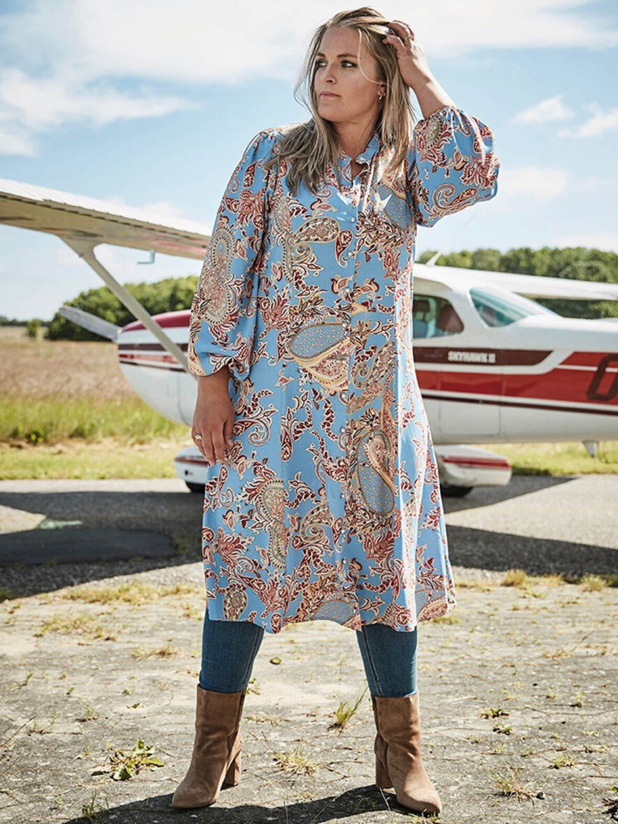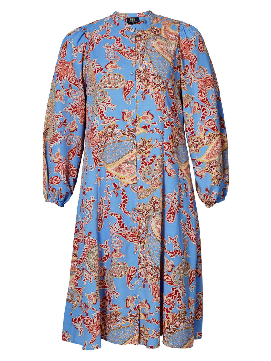 Super smuk kjole med paisley print på lys blå baggrund fra Zoey. Kjolen har rund hals og gennemgående knapluk ned foran med de fineste diamant knapper. Lange ærmer med elastikkant. Smuk A-facon.
