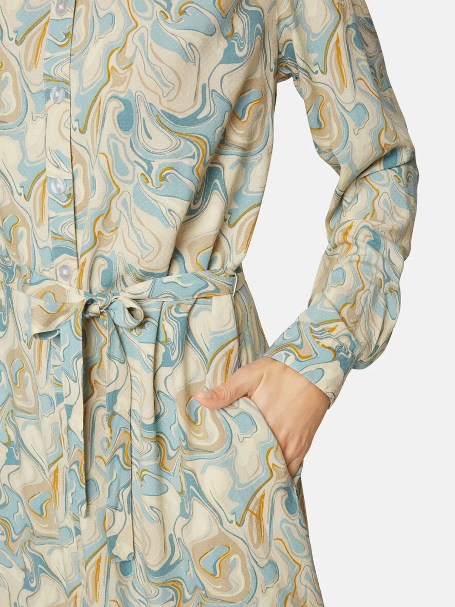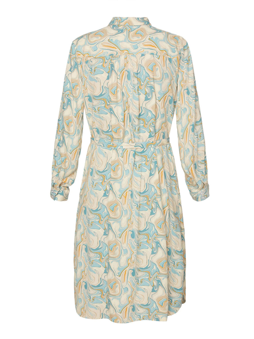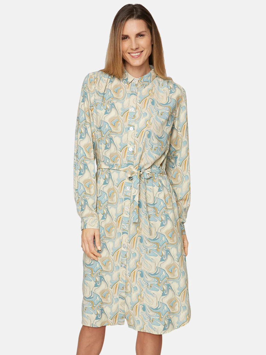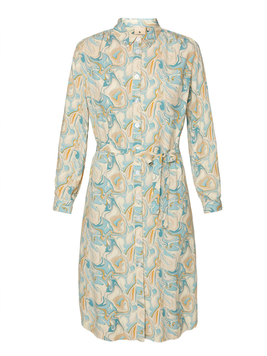 Super flot skjorte-kjole fra Brandtex med lækkert print i lys blå mix. Klassisk krave og gennemgående knapluk ned foran. Lange ærmer med manchetknapluk. Aftageligt bælte i taljen. Let runding forneden og lille slids i siderne. Max 5% krymp.