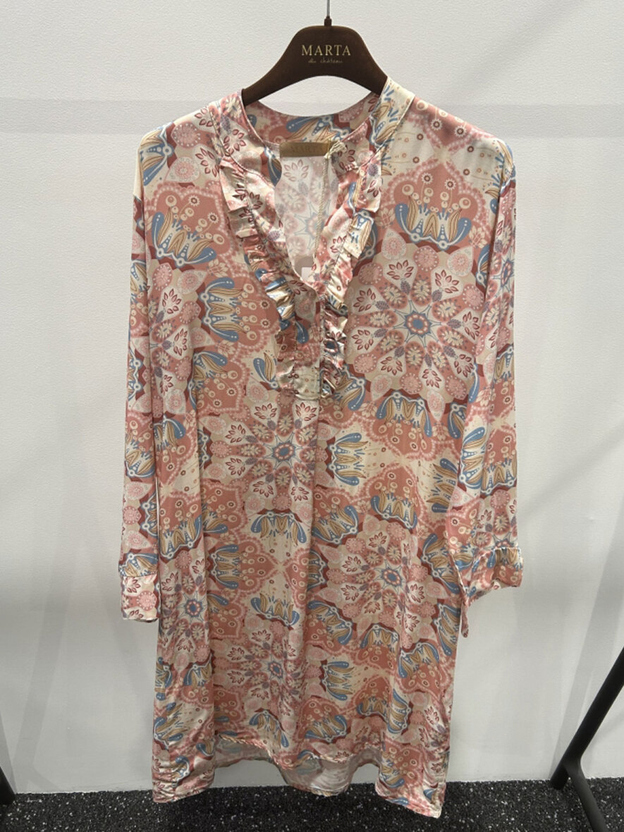 Super sød tunika fra Marta i rosa mix. Rund hals der går ned i V-udskæring med stolpeluk. Super fin flæse langs stolpeluk. Lange ærmer med lille slidskant ved håndleddet.