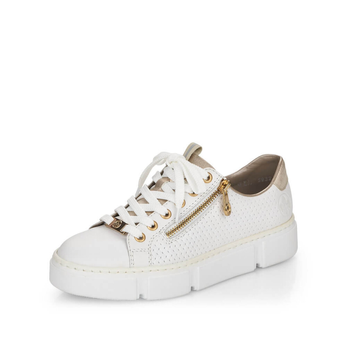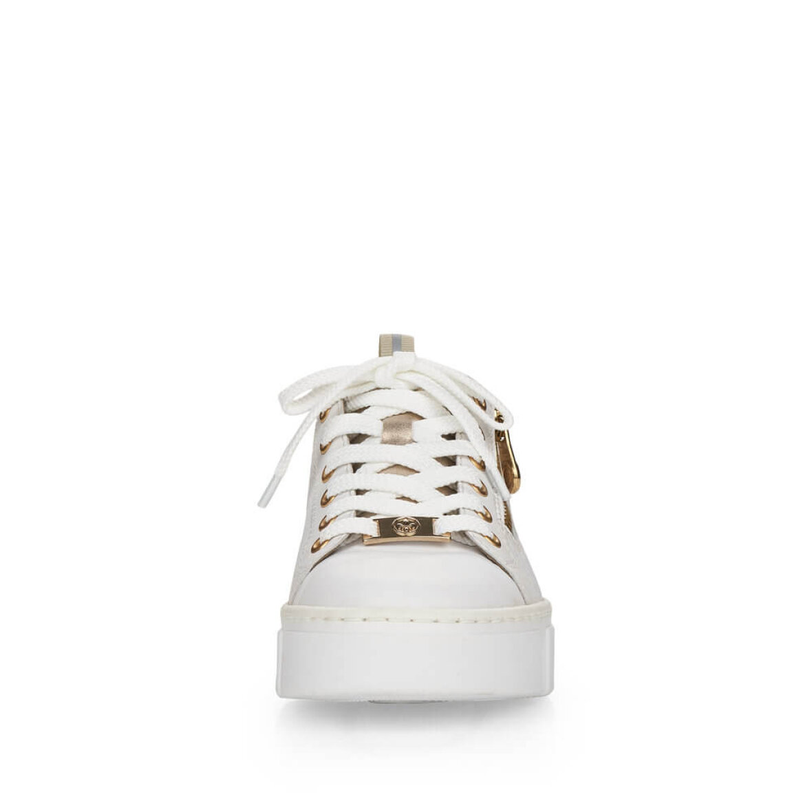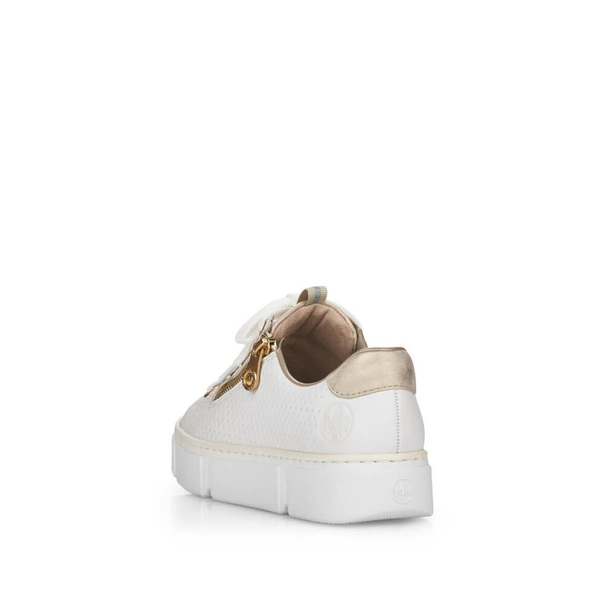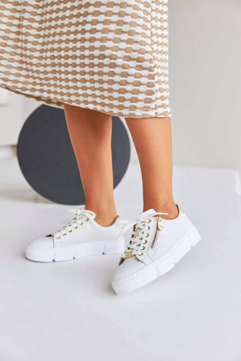 Lette hvide sneakers fra Rieker. Skoen er med flotte guld detaljer og et flet look i siderne af skoen, hvilket giver et fedt look. Skoen er med lynlås i siden, så man nemt kan få skoen af og på. Skoen har tilmed snørebånd over vristen, så den kan tilpasses foden. Ydersålen er en chunky hvid bund med en hælhøjde på 3 cm.