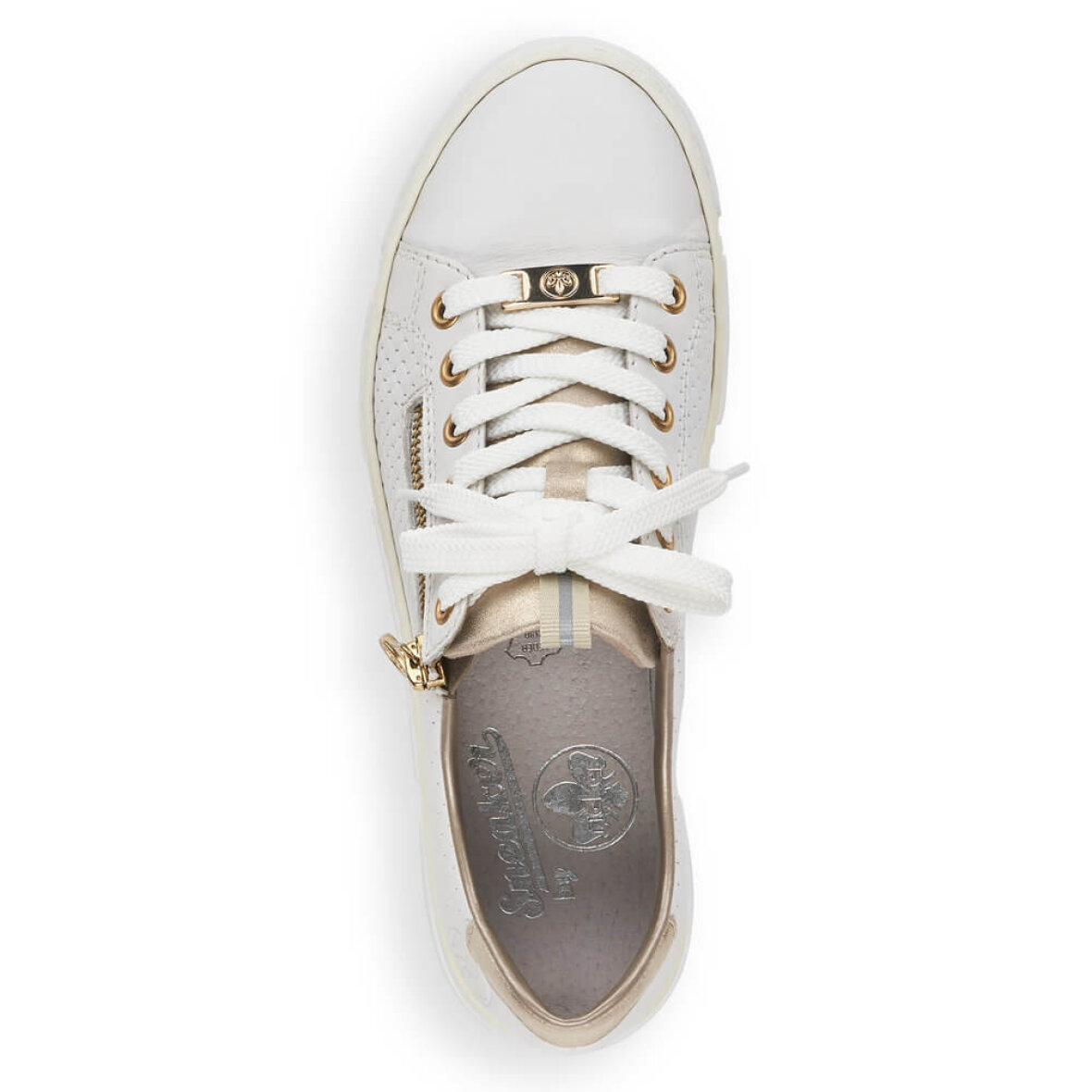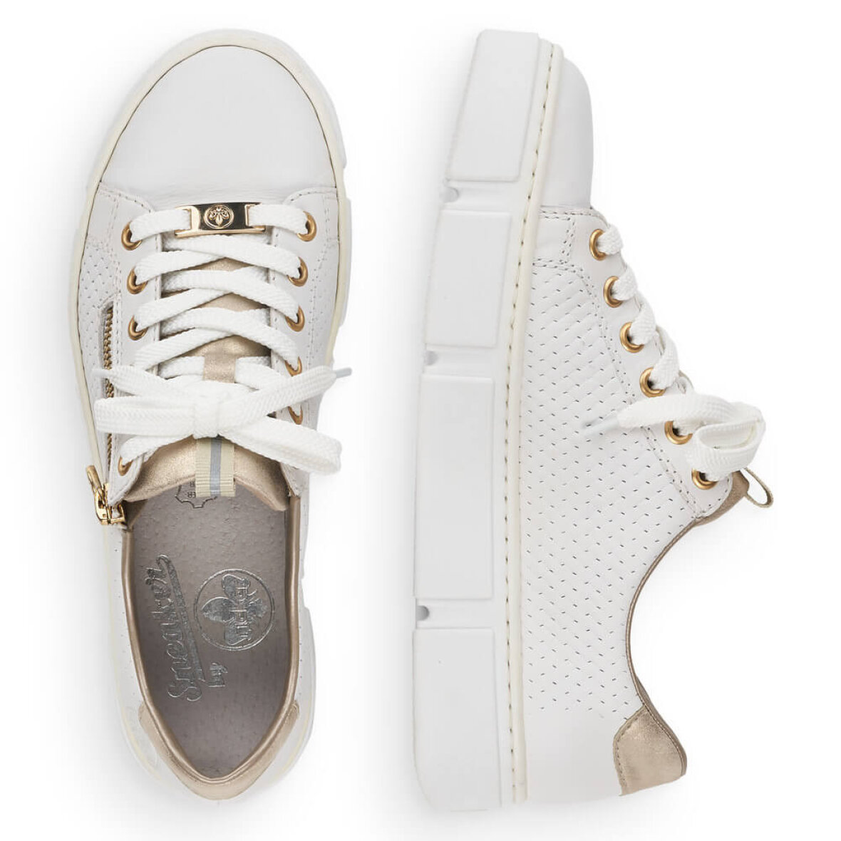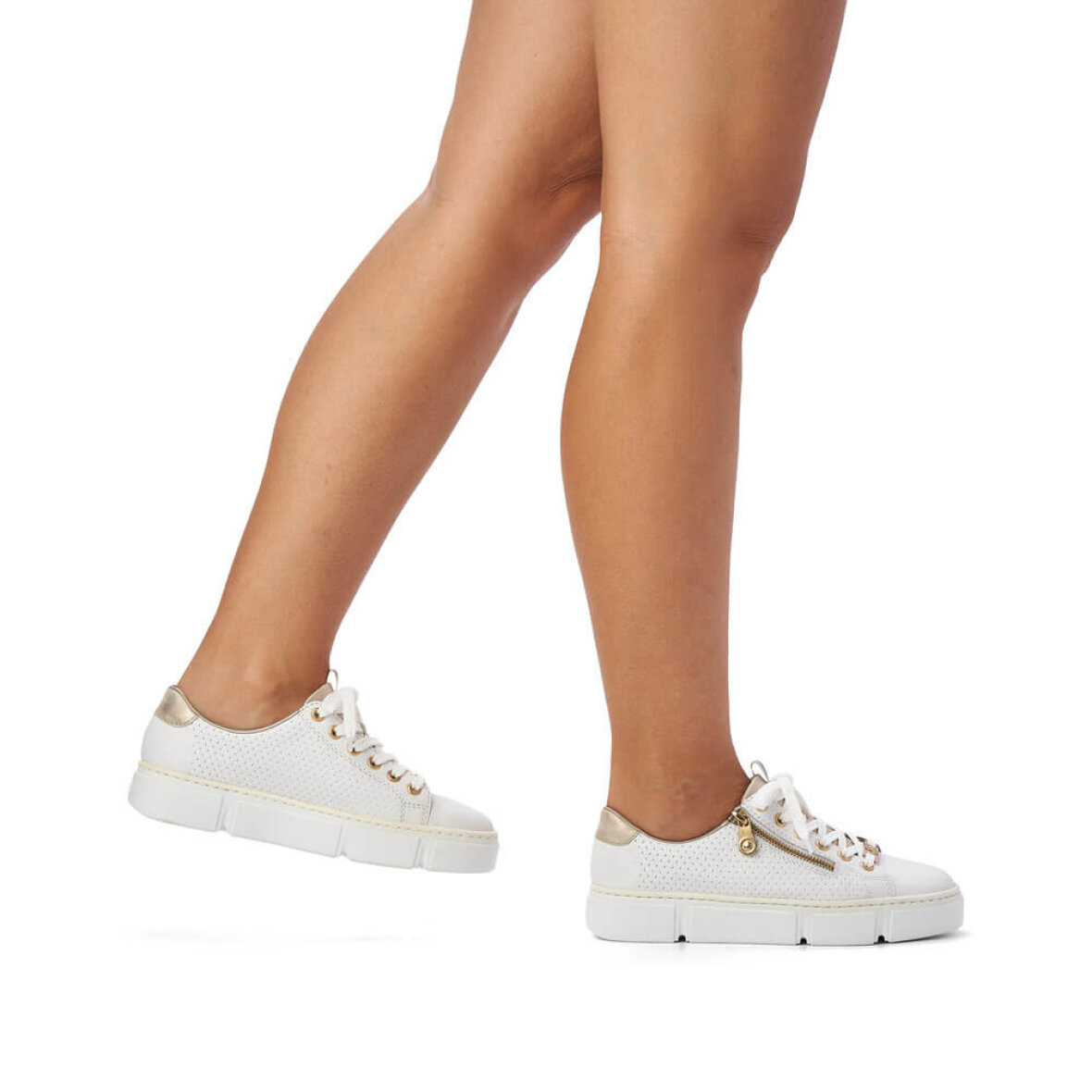Lette hvide sneakers fra Rieker. Skoen er med flotte guld detaljer og et flet look i siderne af skoen, hvilket giver et fedt look. Skoen er med lynlås i siden, så man nemt kan få skoen af og på. Skoen har tilmed snørebånd over vristen, så den kan tilpasses foden. Ydersålen er en chunky hvid bund med en hælhøjde på 3 cm.