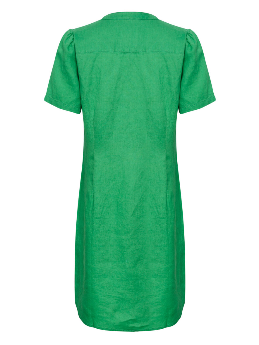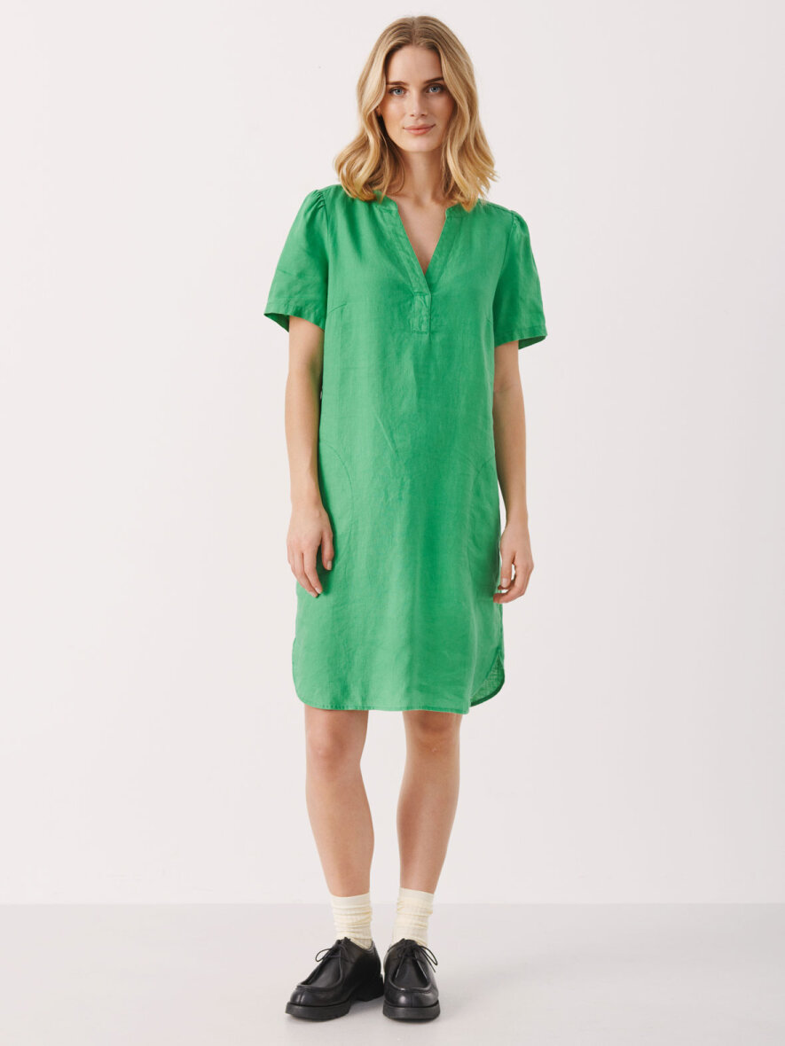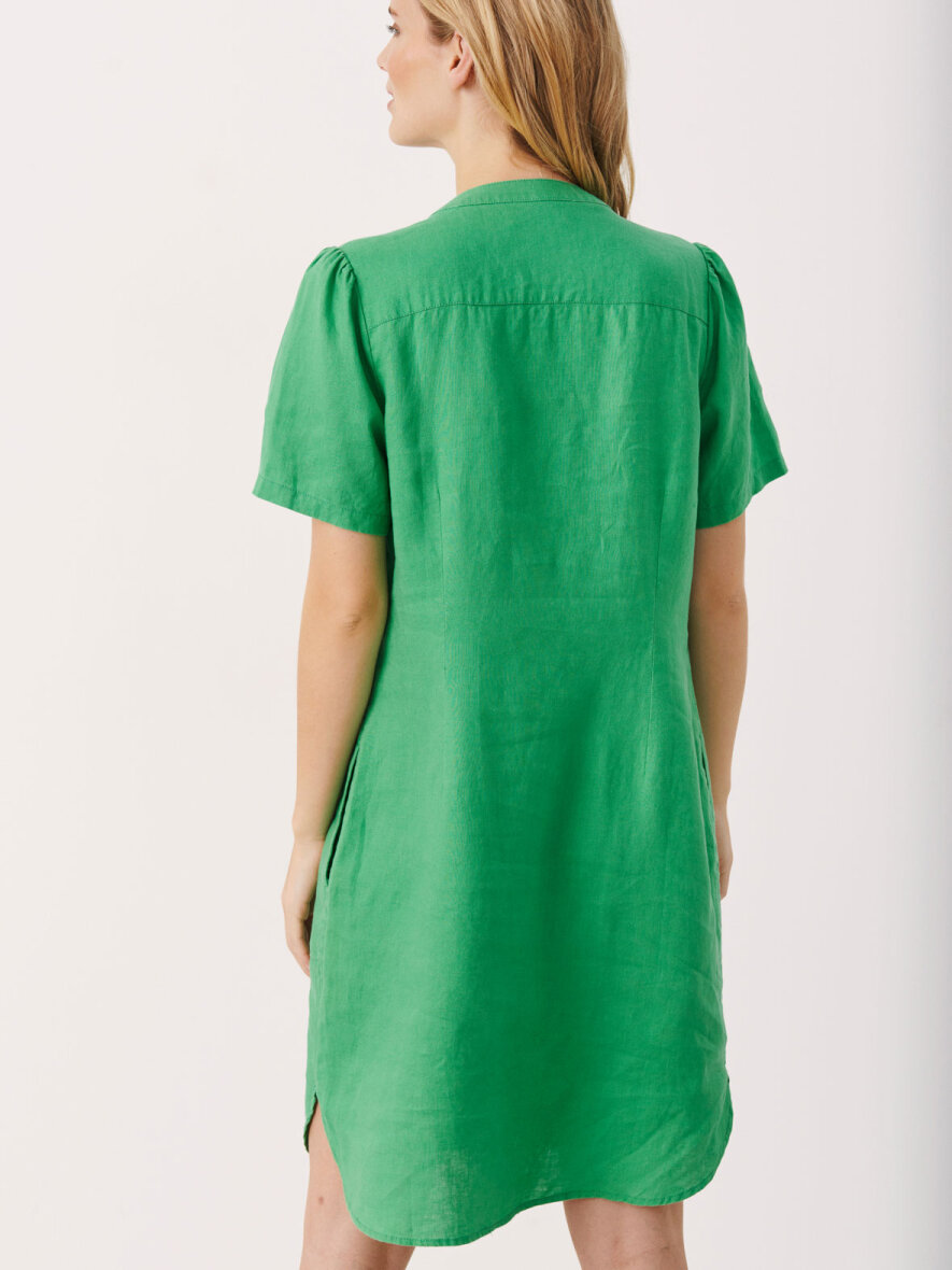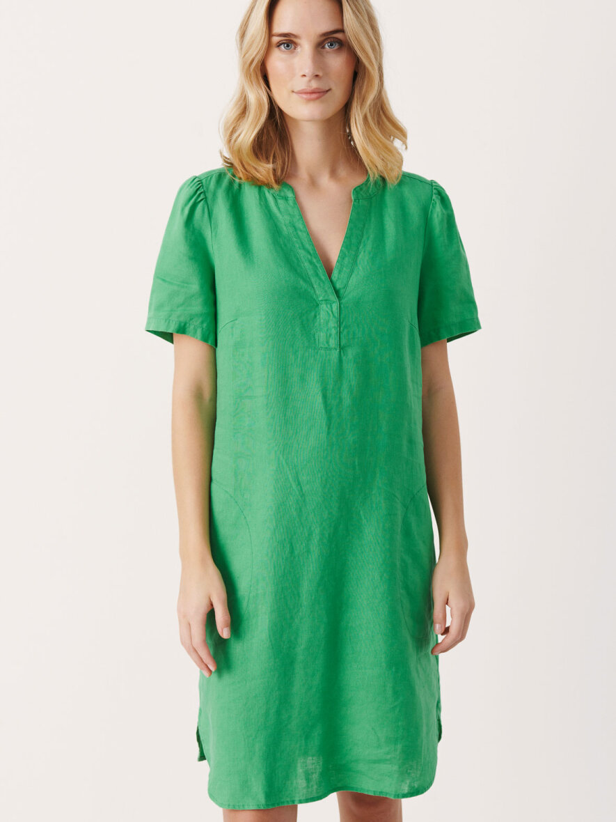 Enkel og elegant hør kjole fra Part Two. Rund hals med V-udskæring. Korte ærmer med lidt puf-effekt. Lettere figursyet og to store sidelommer. Let runding forneden. Max 5% krymp.