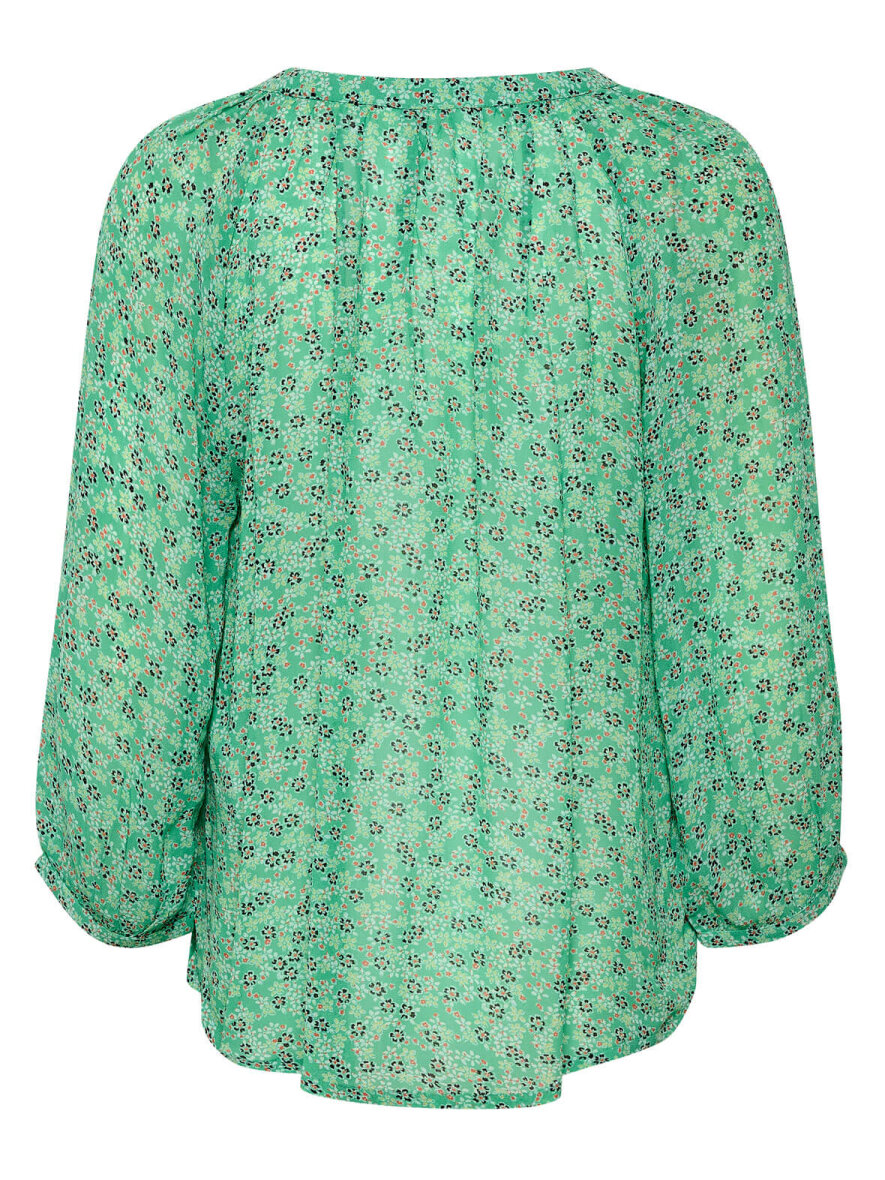 Fin bluse med blomstret print fra Part Two i grøn mix med 3/4 ærmer. Blusen har V-udskæring og er en smule længere bagtil forneden. Blusen er semitransparent.