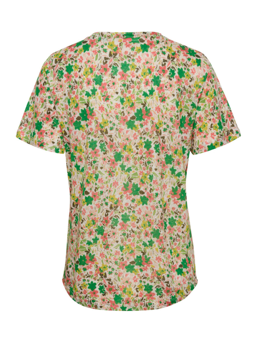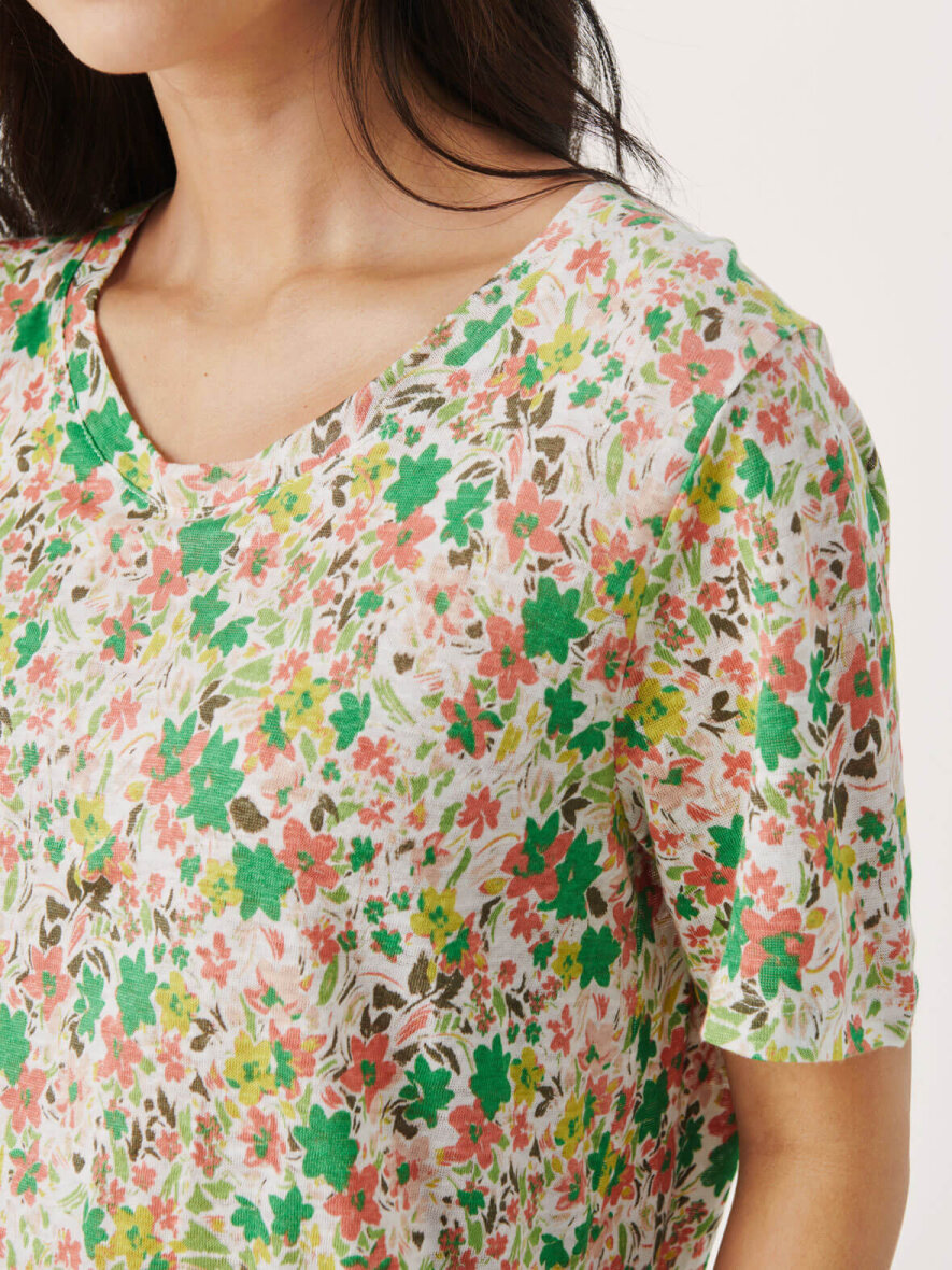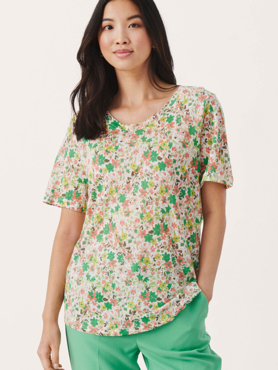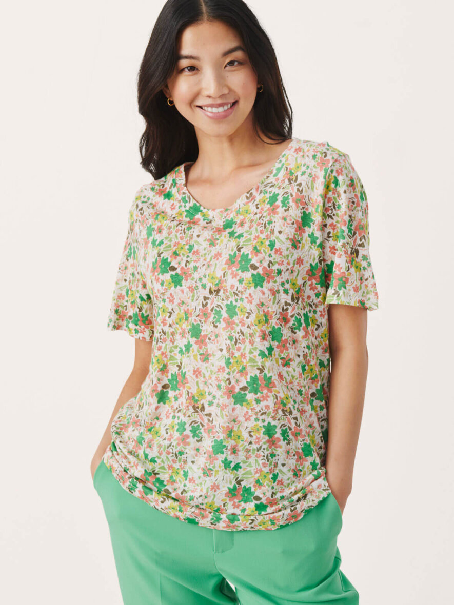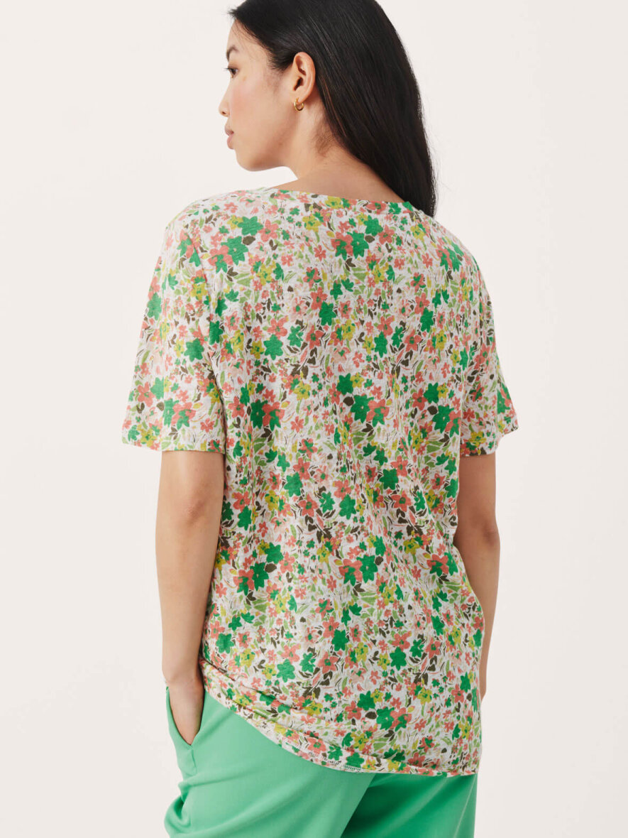 Klassisk T-shirt i hør fra Part Two med all-over blomsterprint i grøn og koral. Rund hals og korte ærmer. Let runding forneden. Max 5% krymp.