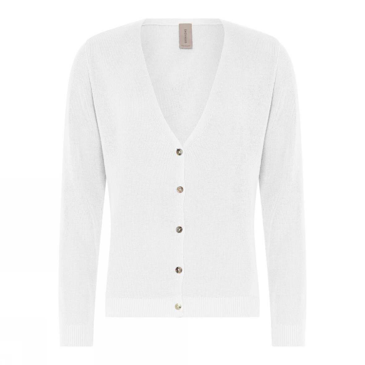 Flot klassisk hvid strikket cardigan fra Skovhuus. Cardiganen er med v-halsudskæring og gennemgående knapper langs fronten, så den kan bruges lukket og åbentstående. Cardiganen er med lange ærmer og ribkant ved alle åbninger.