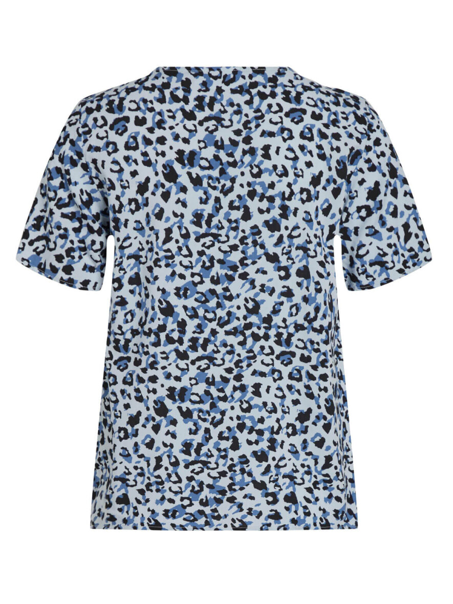 Lækker blød basistop fra VILA med leo print i blå nuancer. Korte ærmer og V-udskæring. Style den evt. til en nederdel.