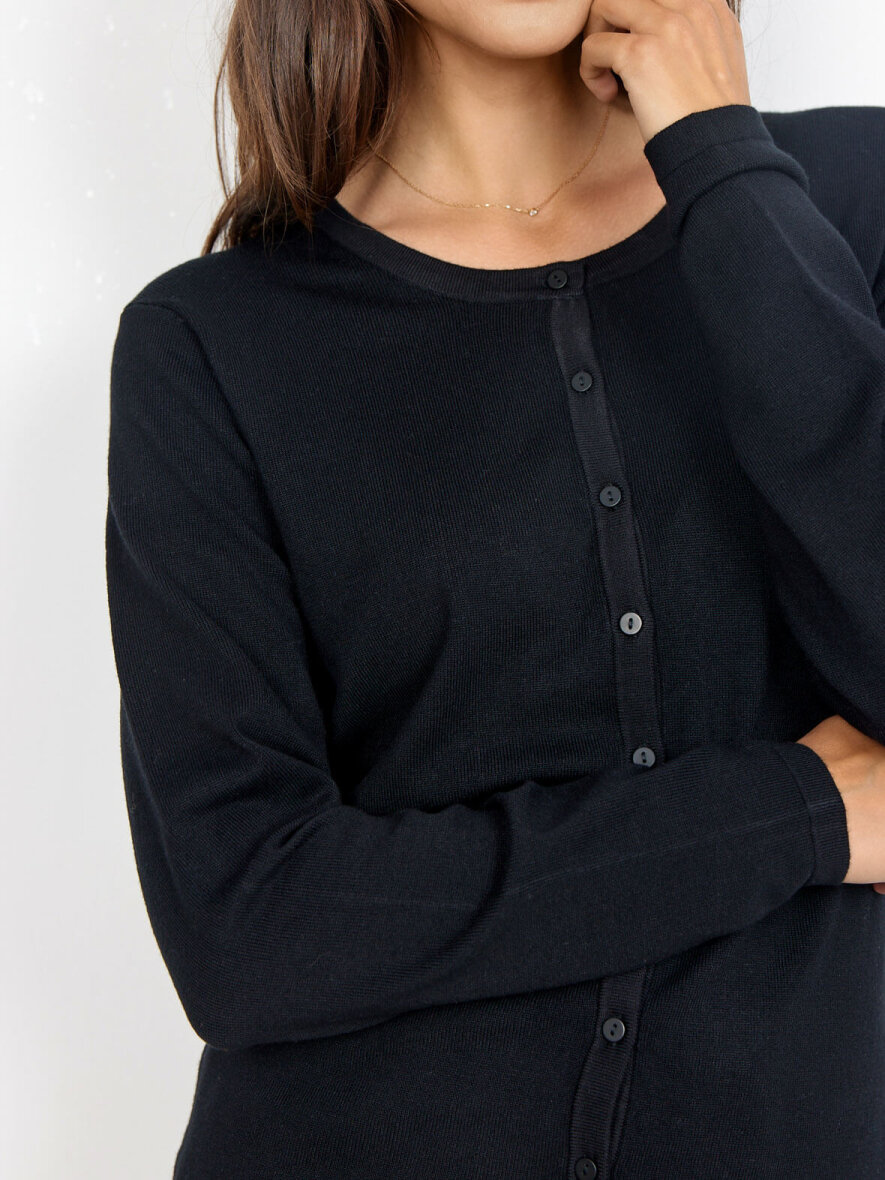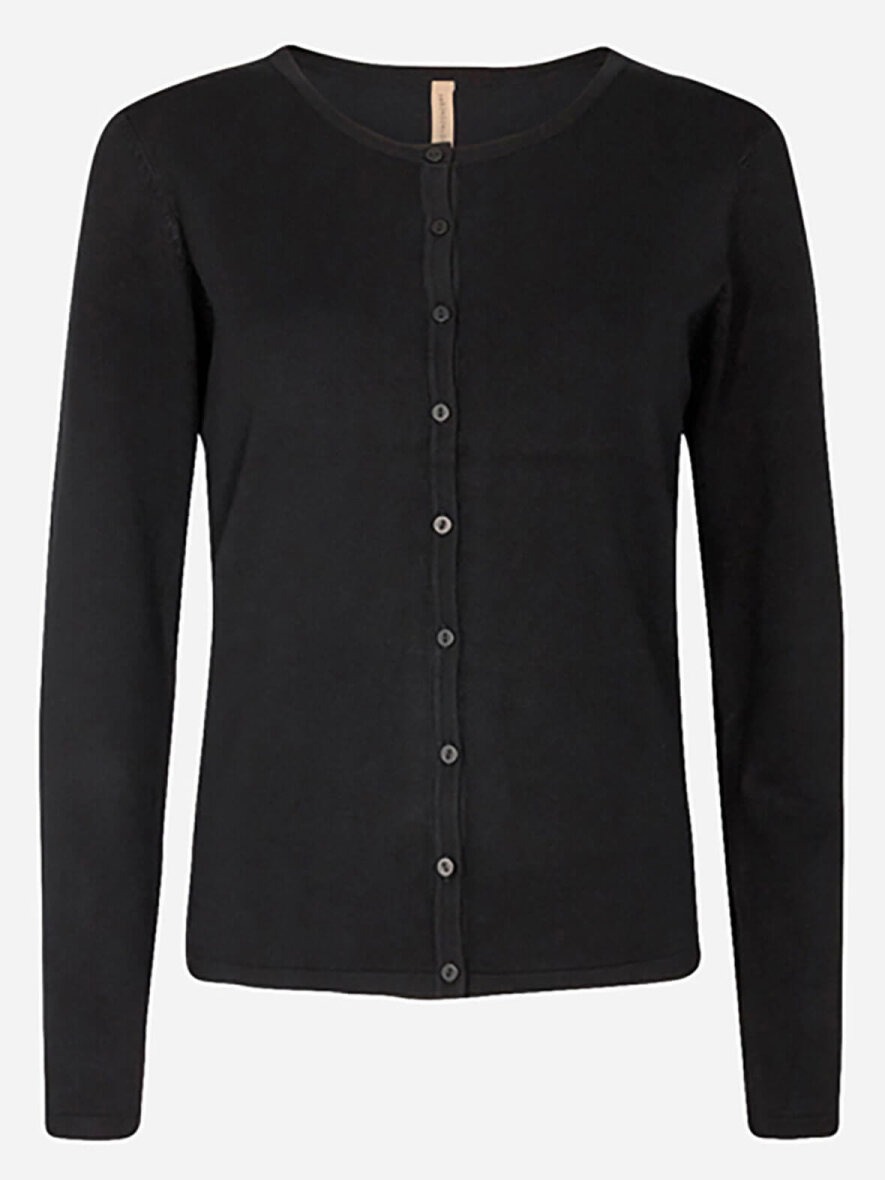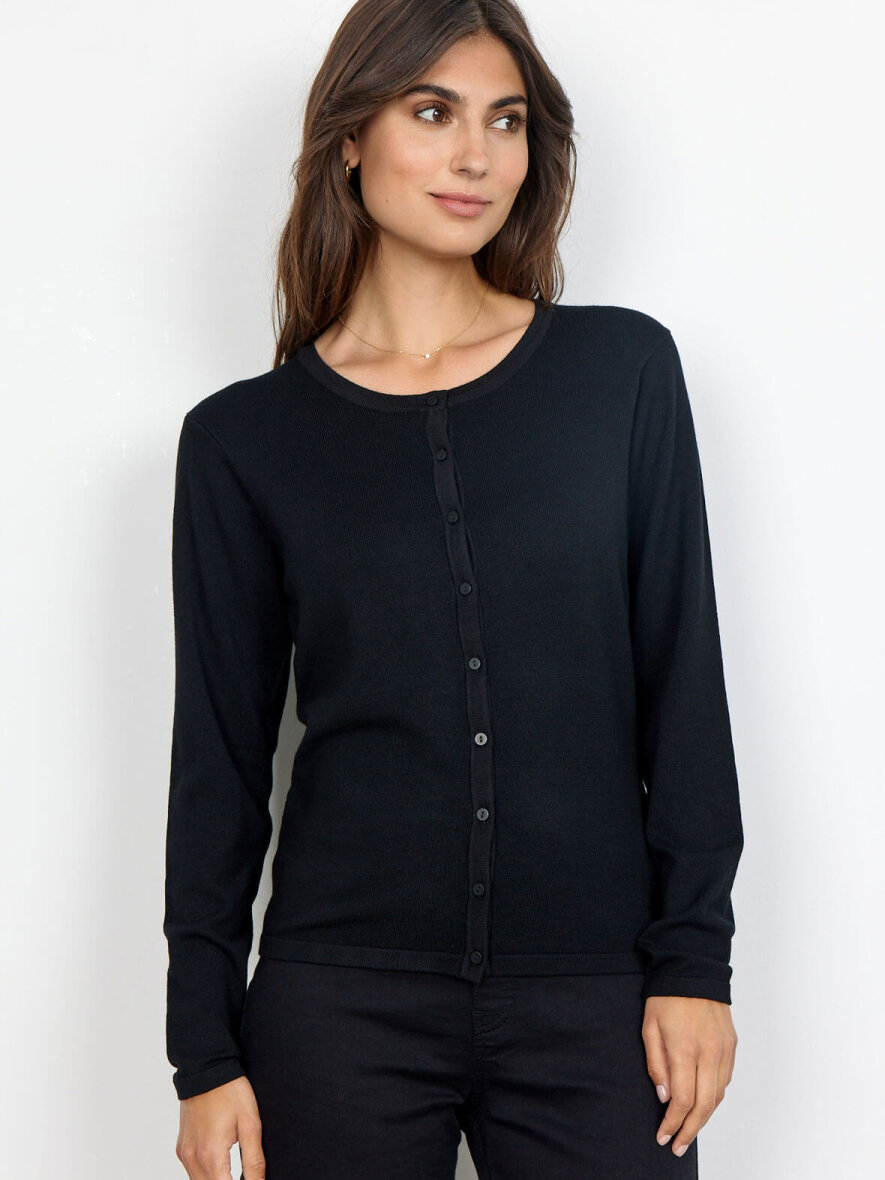 Fin basis cardigan fra Soyaconcept. Modellen er gennemknappet og med lange ærmer og rund halsudskæring. Kvaliteten er en lækker og blød viskoseblanding. Et must have i garderoben, som nemt kan bruges lukket, som en bluse til bukser eller nederdele, eller åbentstående over kjoler.