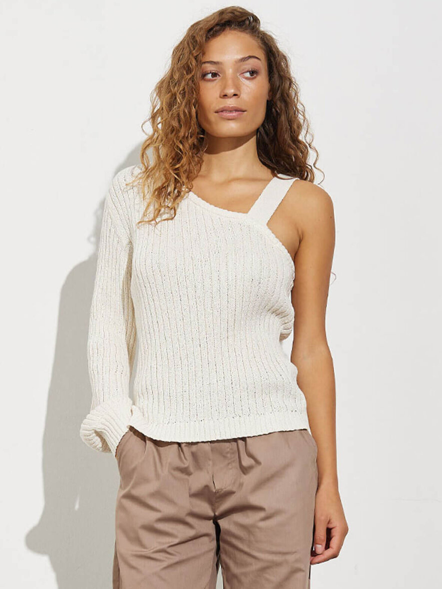 Ribstrik fra mbyM med one shoulder. Strop i strik og lang ærme i den anden side. Lille ribkant ved ærme og nederst på strikken. Max 5% krymp.