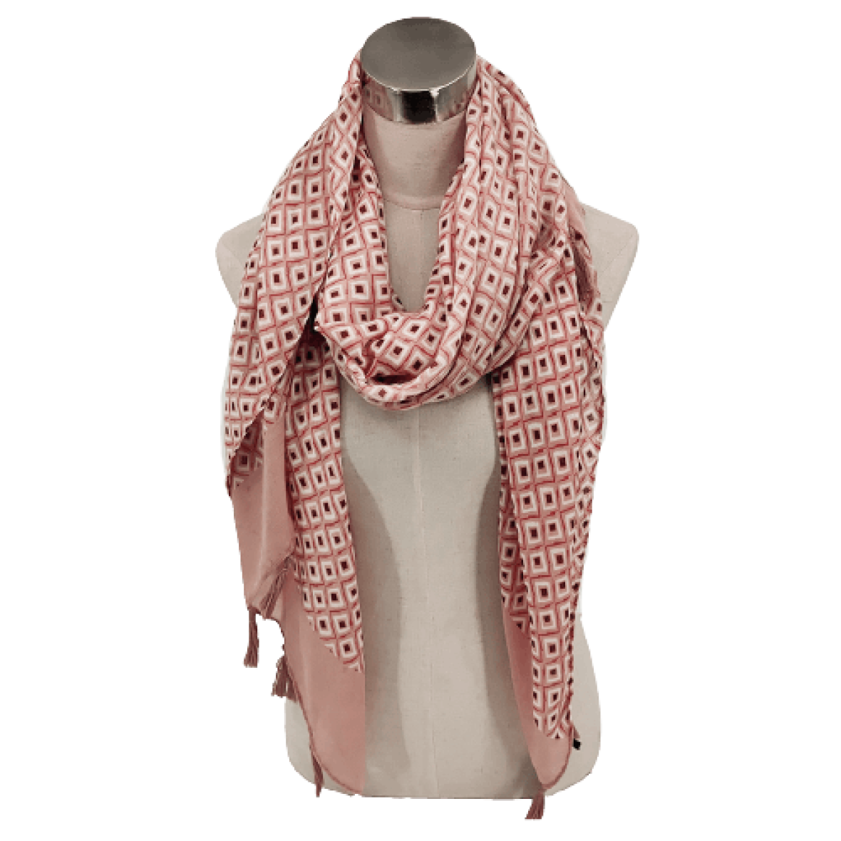 Lækkert blødt tørklæde fra Bæltekompagniet i et rosa mønster. Tørklædet har lange frynser i begge ender.