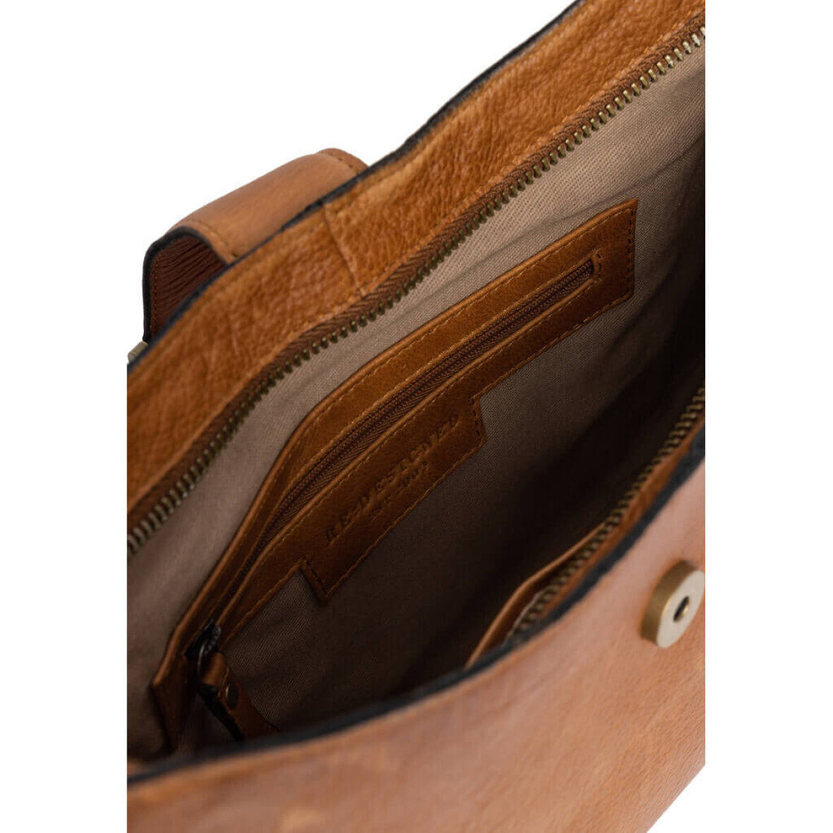 Tasken er med et stort åbent rum med en indvendig stiklomme samt en lynlås lomme. Tasken er med et flot metal detalje foran med magnet knaplukning. Tasken lukkes med lynlås og har tilmed en lynlås lomme udenpå.