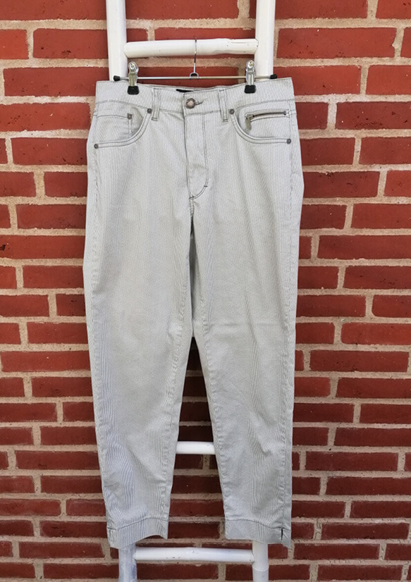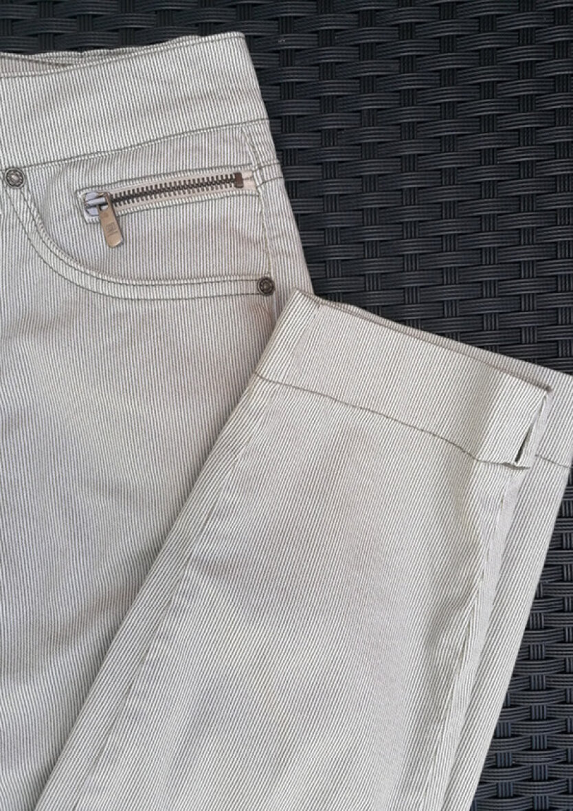 Flotte stribet jeans fra Bessie. Buksen er med smalle grønne og hvide striber, med grønne stikninger, hvilket giver et flot look.