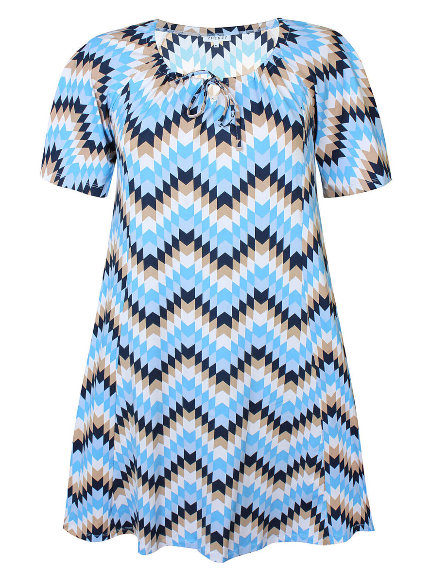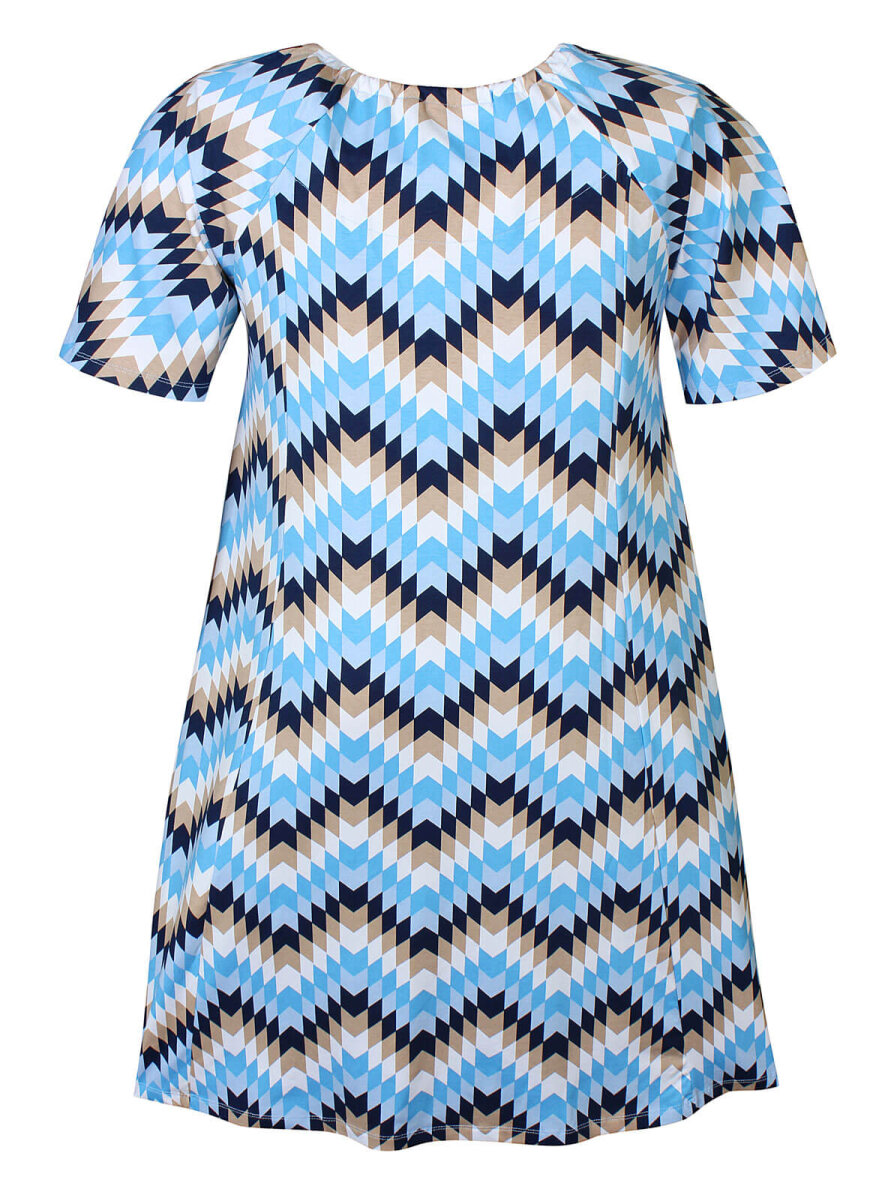 Sød viskose kjole fra Zhenzi med et flot grafisk mønster i hvid, blå og beige. Rund hals med bindebånd. Korte ærmer. Kjolen er i A-facon.