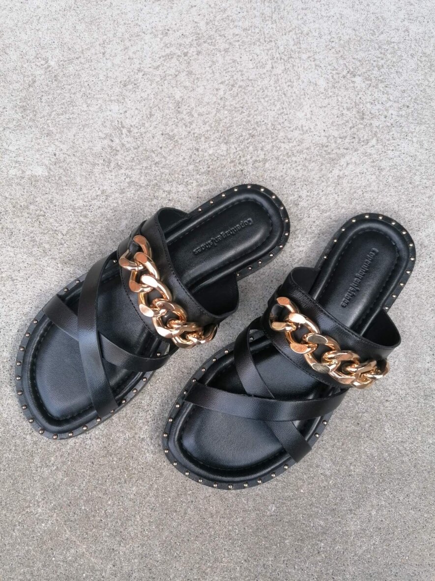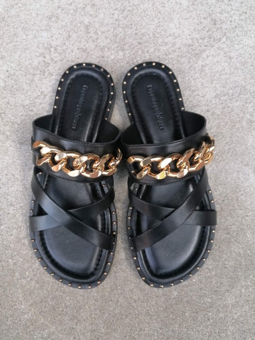 Sandalen er udført i sort glat skind på overdelen og indeni sandalen. Indlægssålen er lavet i blødt latex skum, hvilket gør sandalen dejlig behagelig at have på. Sandalen er dekoreret med en stor guldkæde på fronten og små guldnitter langs ydersålens kant - hvilket giver et fedt og rå look.