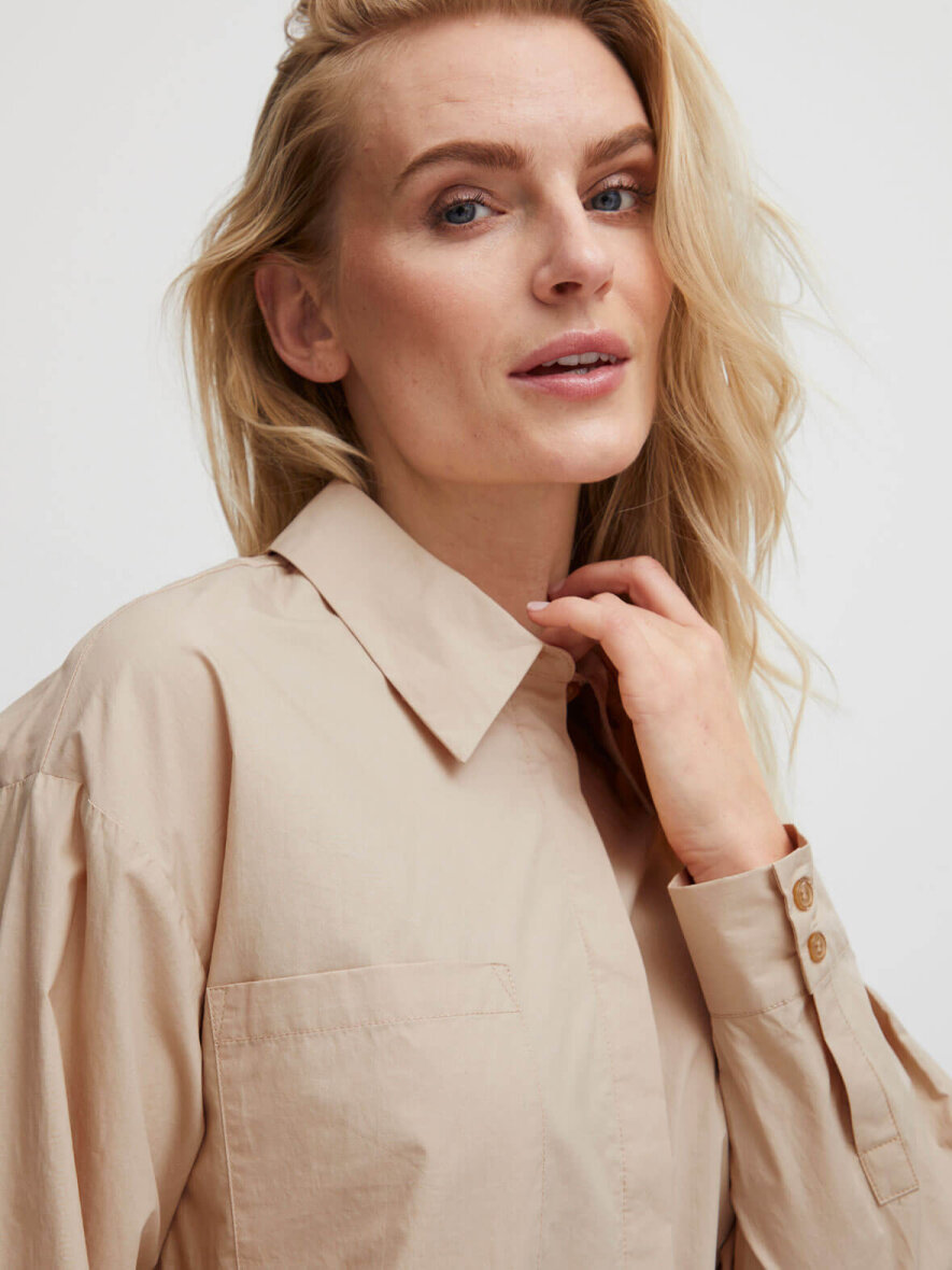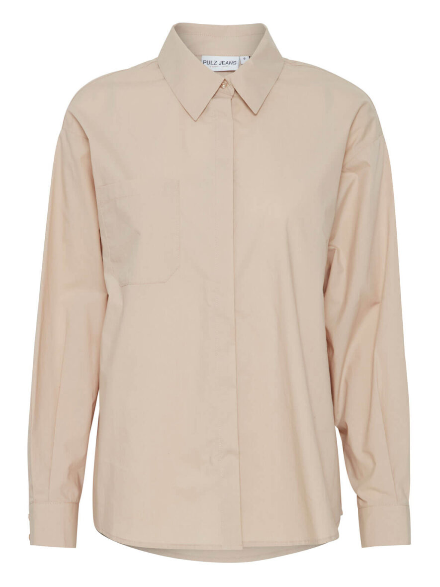Enkel og klassisk skjorte fra PULZ JEANS. Klassisk krave og knappanel ned foran. Lange ærmer med manchetknapluk. Let runding forneden. Lækker bomuldskvalitet.