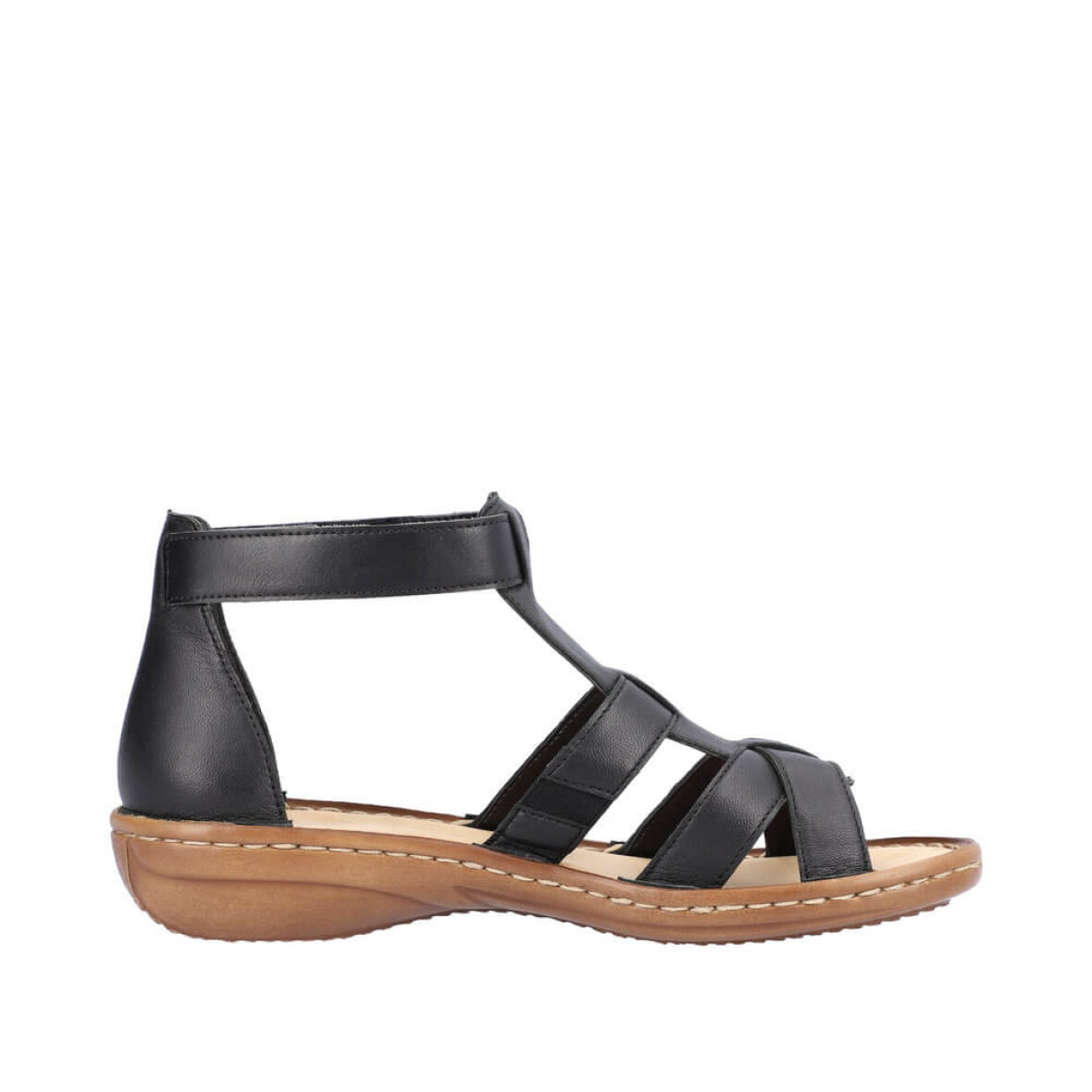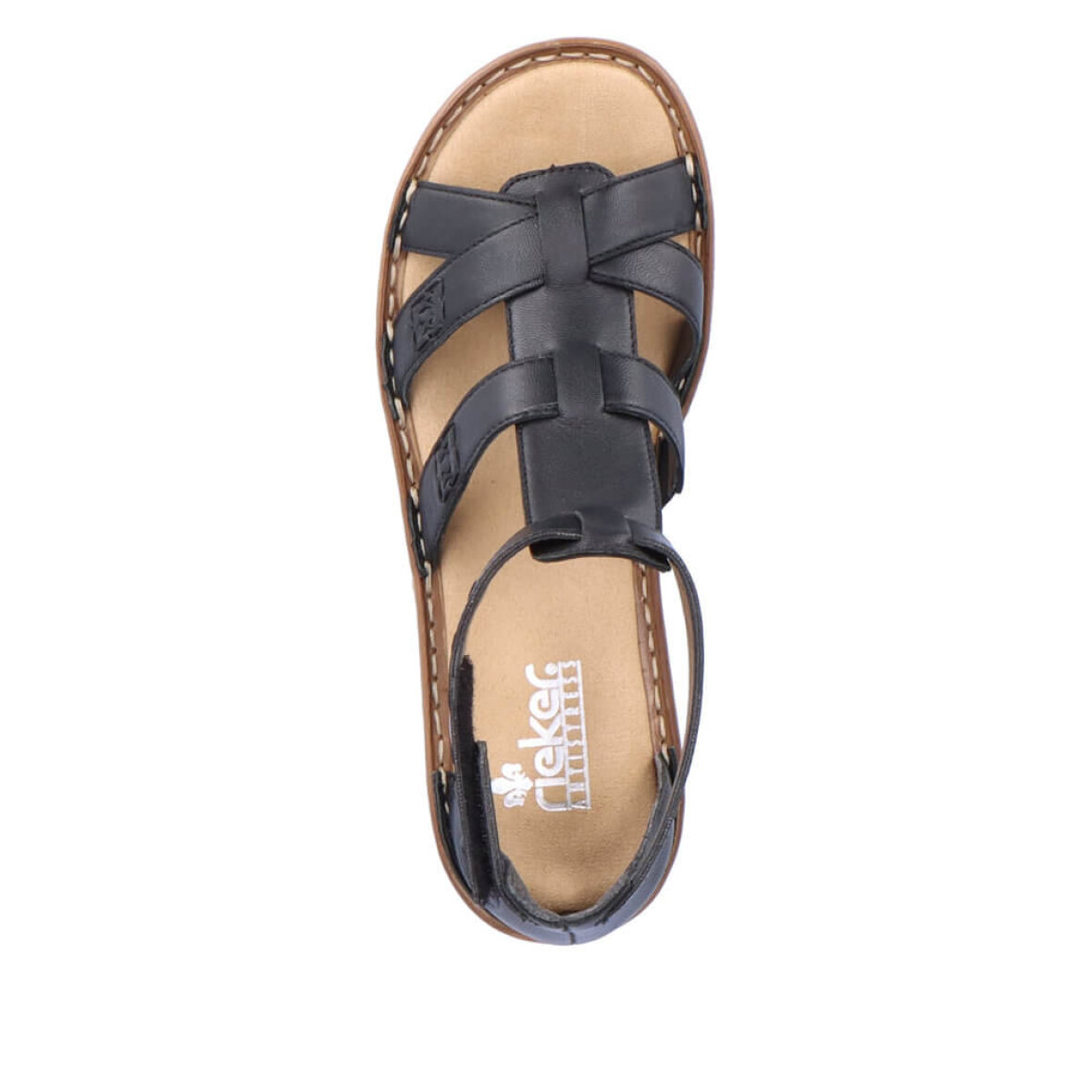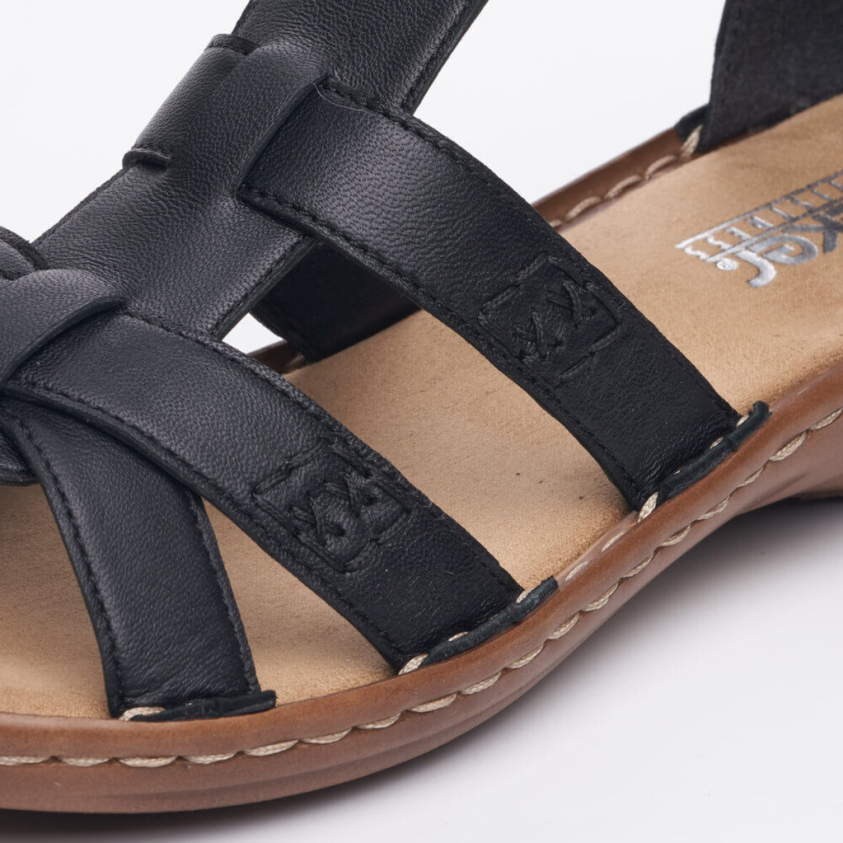 Super flot sort sandal med de fineste detaljer fra Rieker. Overdelen er lavet i skind med fine stikninger og et flot rem design på overdelen, hvilket giver sandalen et fedt og feminint look.