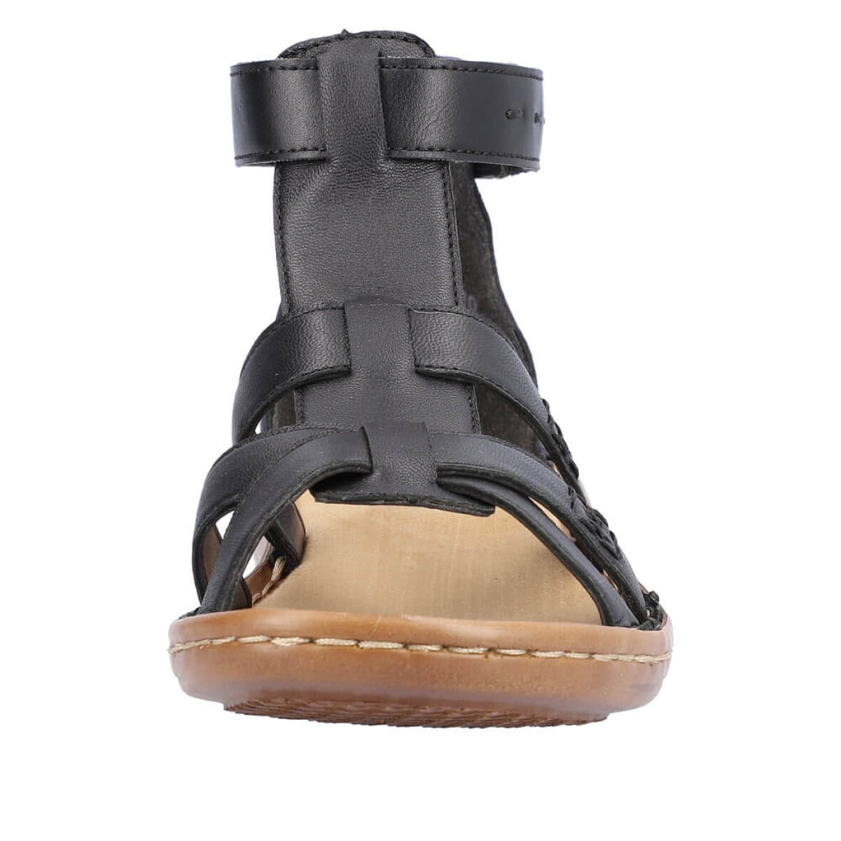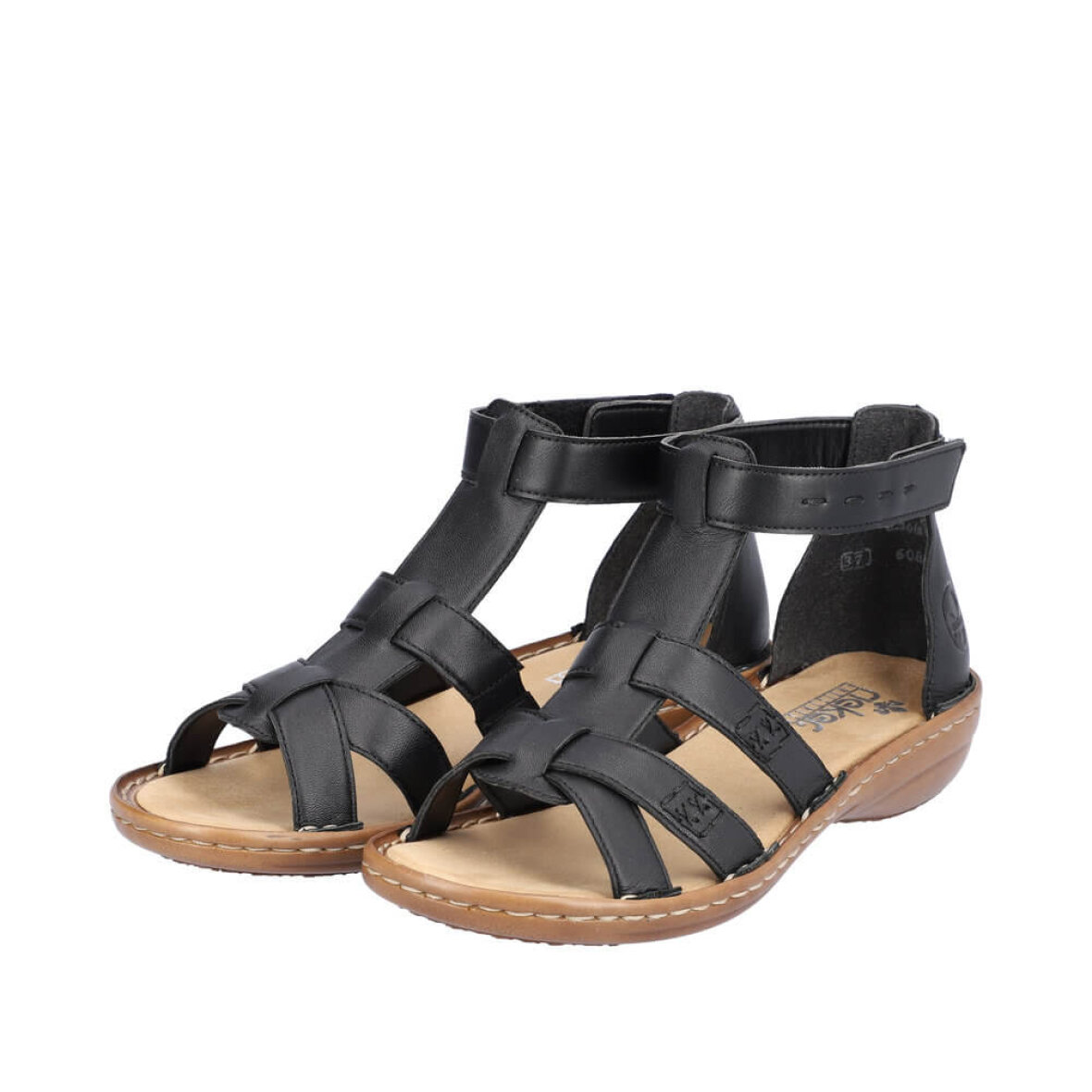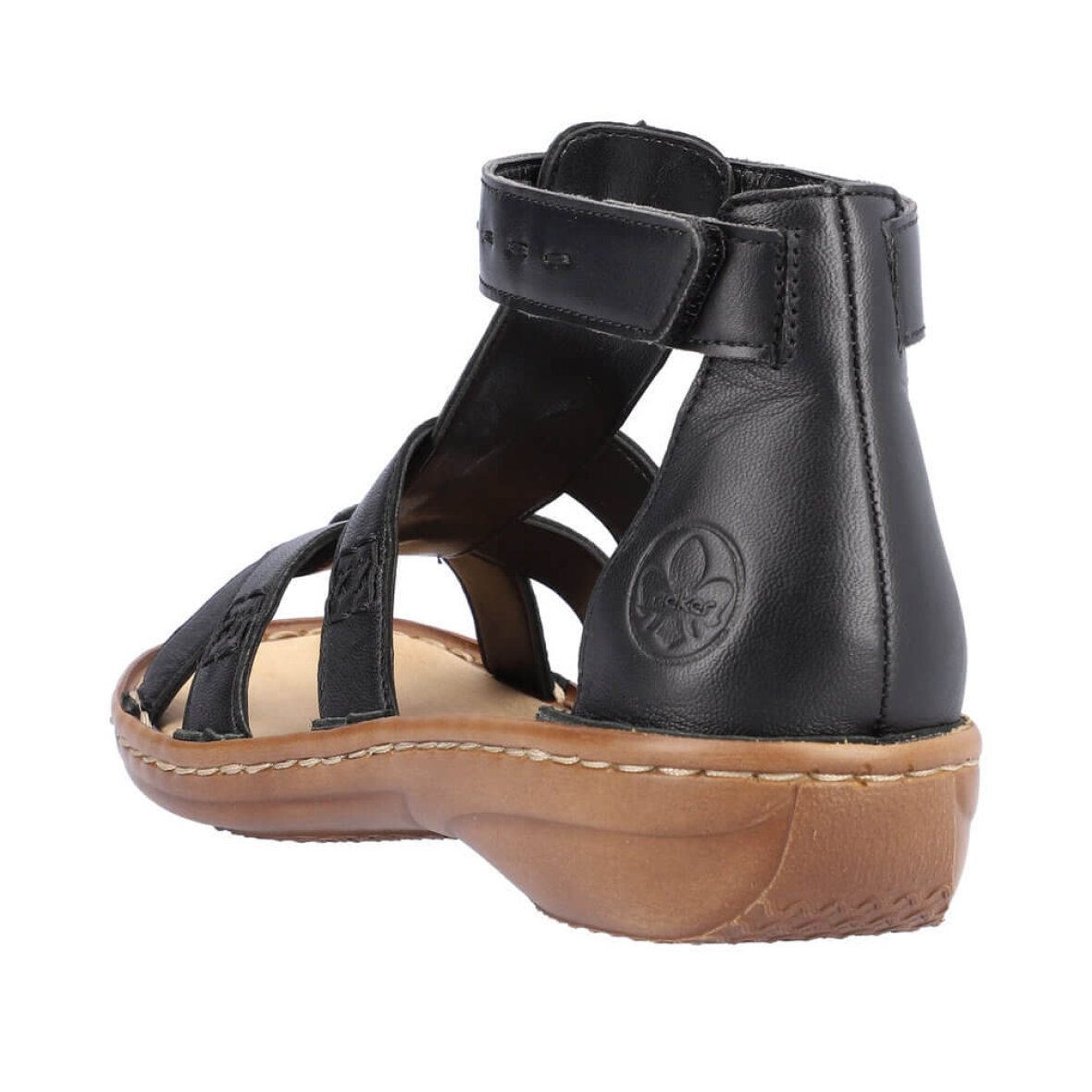 Super flot sort sandal med de fineste detaljer fra Rieker. Overdelen er lavet i skind med fine stikninger og et flot rem design på overdelen, hvilket giver sandalen et fedt og feminint look.