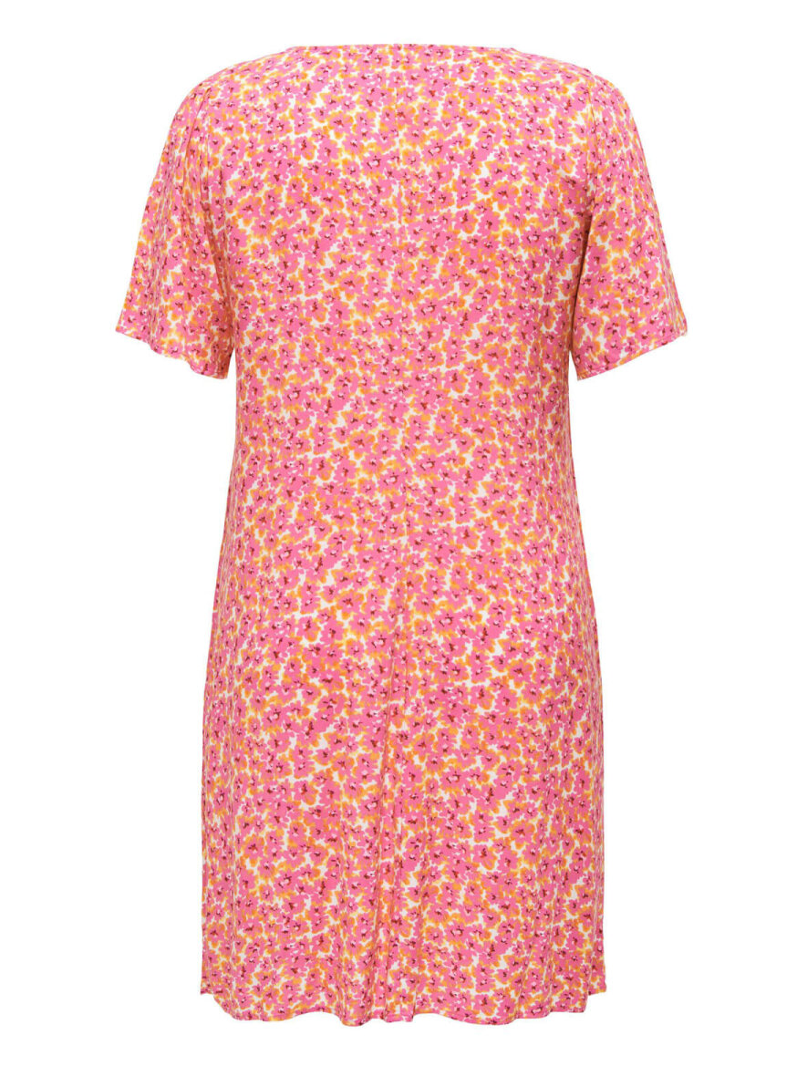 Smuk sommerkjole fra ONLY Carmakoma med all-over blomsterprint i pink/orange. Kjolen har V-hals og gennemgående knapluk. Korte ærmer. Style den evt. med et par hvide sneakers.