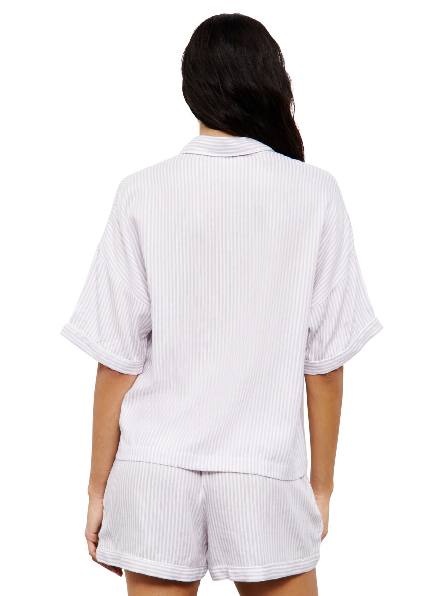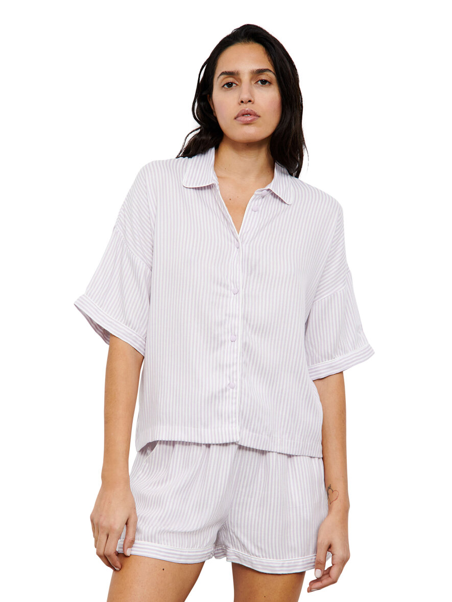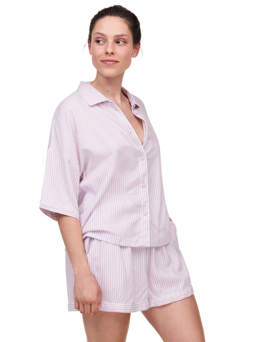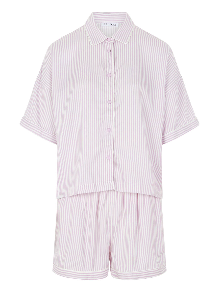 Smukt nattøjssæt lavet i blød viskose fra Femilet. Sættet er designet med smalle striber i farvekombinationen hvid og lavendel. Overdelen er med krave og gennem knapning samt korte flagermus ærmer med påsyet kant. Shortsene i matchende striber har elastikkant om taljen og lommer i siderne.
