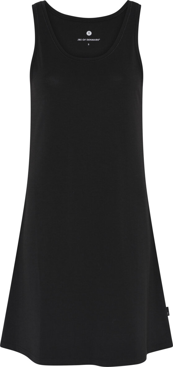 Dejlig lang kjole i en blød bambusviskose fra JBS of Denmark. Kjolen er med brede skulderstropper. En enkel sort basis kjole af høj kvalitet, som holder vask efter vask. Kjolen har ingen generende syninger. Materiale kombinationen giver et luksuriøst og lækkert design, der også er antibakterielt. God pasform.