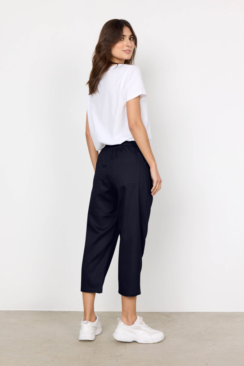 Smarte og behagelige bukser fra Soyaconcept i en flot navy blå farve. Buksen er med elastik i taljen samt bindebånd.