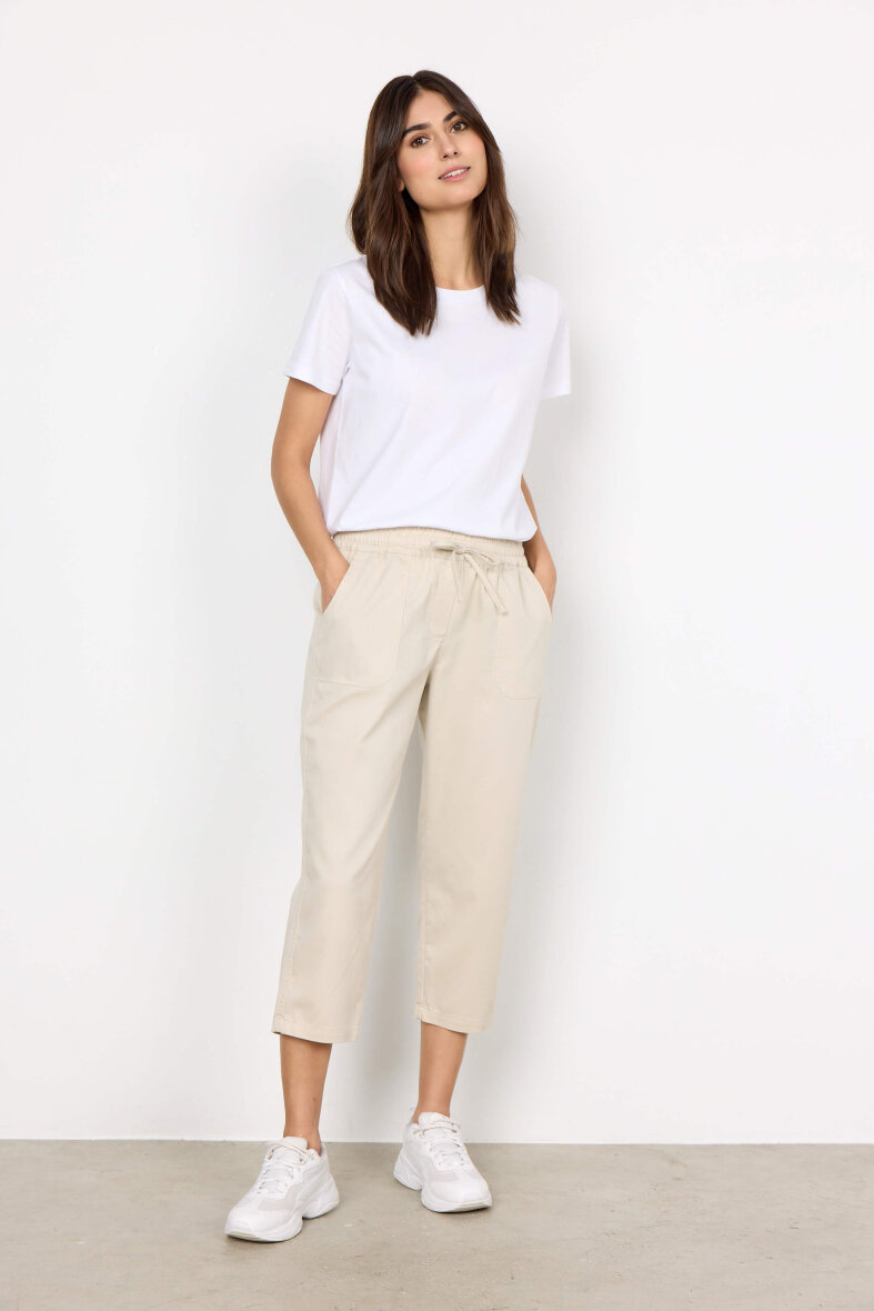 Smarte og behagelige bukser fra Soyaconcept i en flot lys sandfarve. Buksen er med elastik i taljen samt bindebånd.