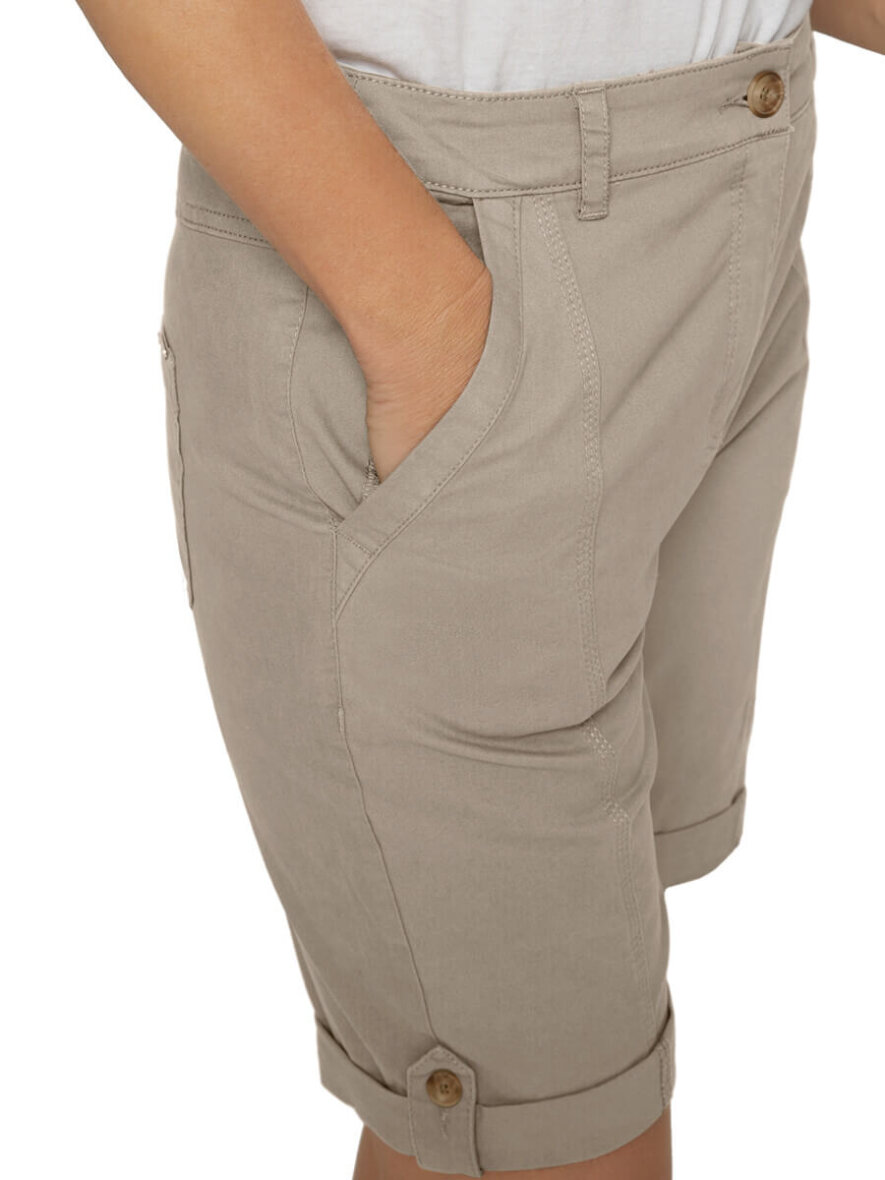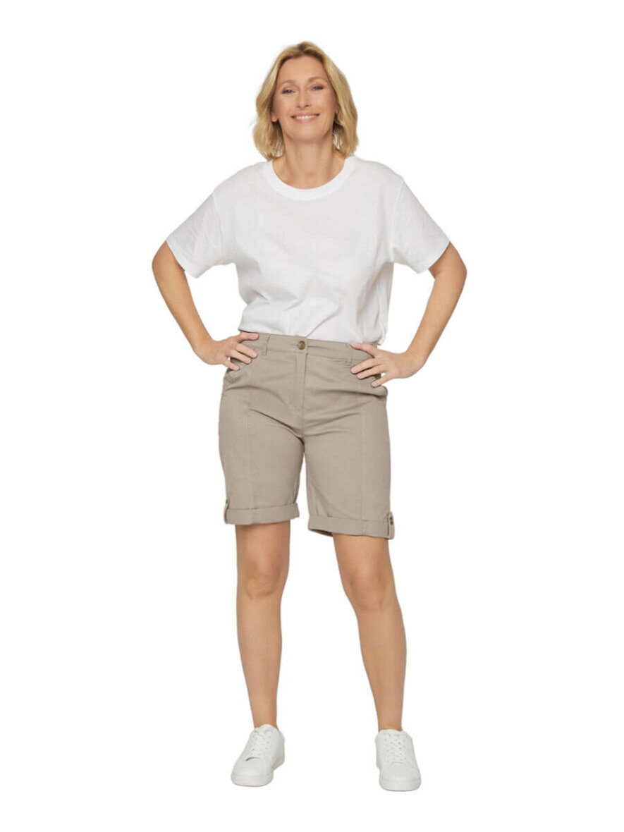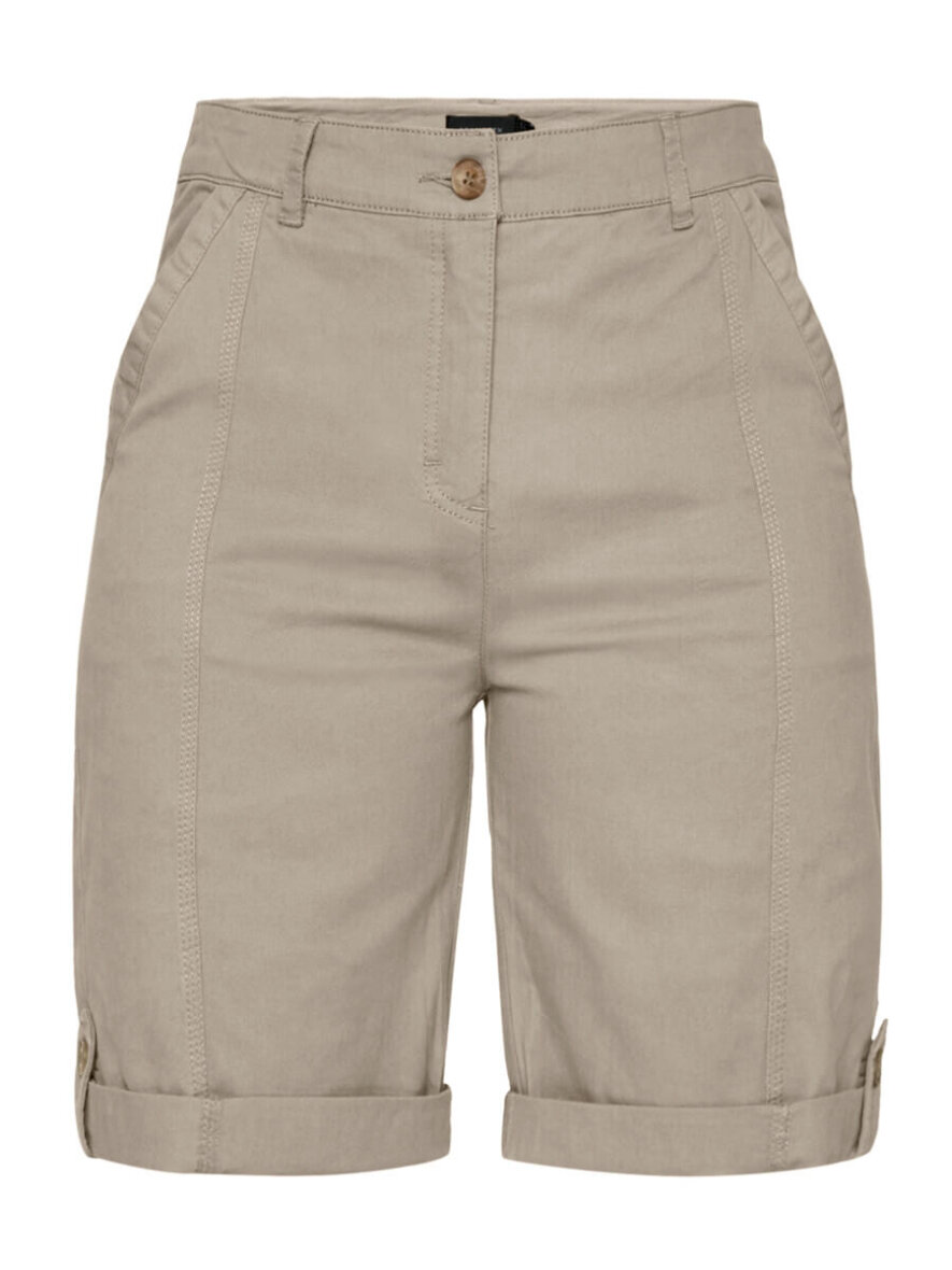 Smarte sandfarvet shorts fra Brandtex. De korte shorts er med mellem høj talje og 4 lommer. Shortsene lukkes med knap og lynlås.
