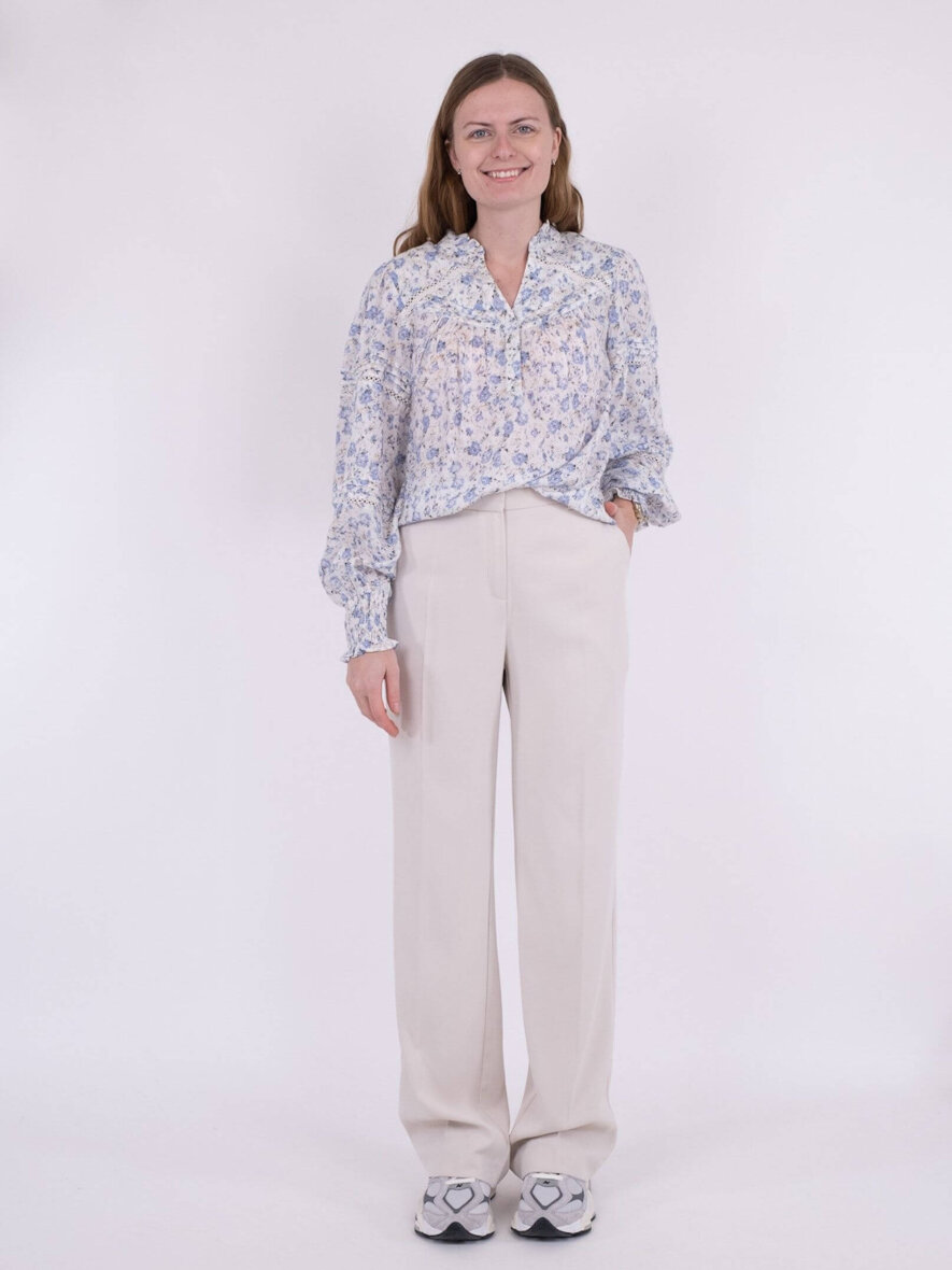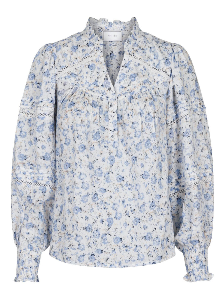 Feminin bluse med all-over blomsterprint fra Neo Noir. Rund hals med lille flæsekant - går ned i V-udskæring og stolpeluk. Lange ærmer med smock kant. Masser af fine blonde og flæsedetaljer. Max 5% krymp.