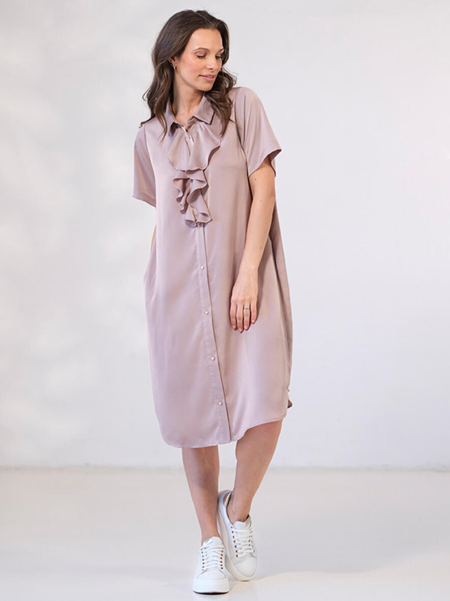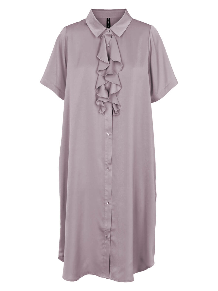 Smuk skjortekjole fra Prepair i en skøn satinkvalitet med skjortekrave og kalvekrøs fra halsen og ned.