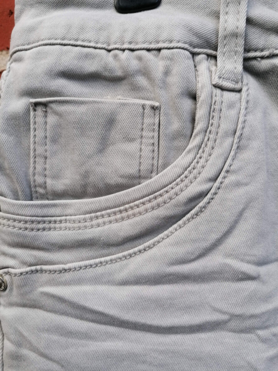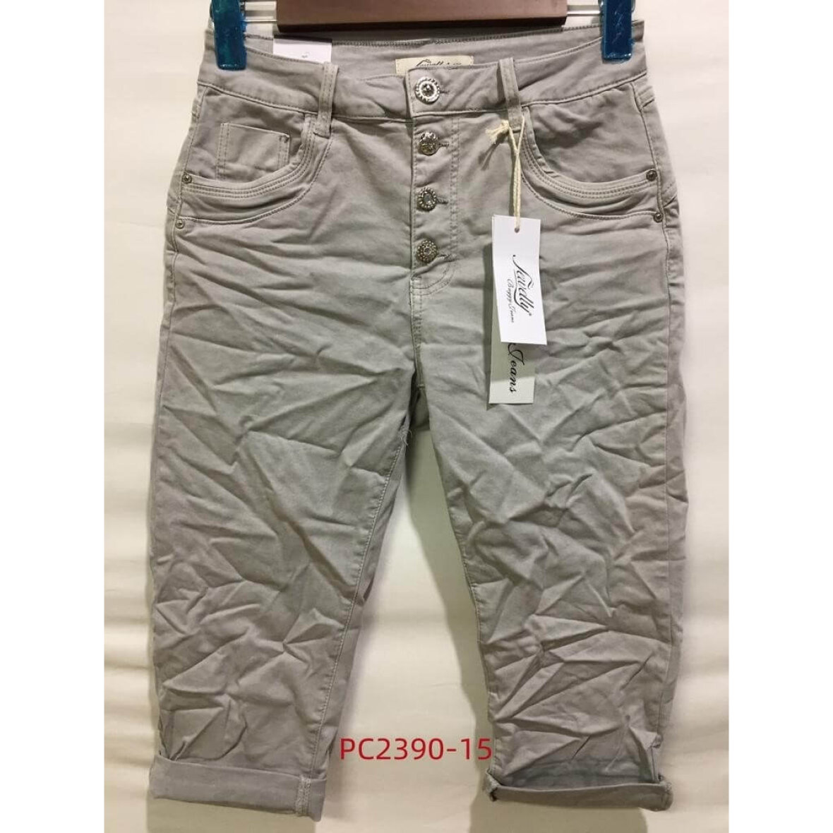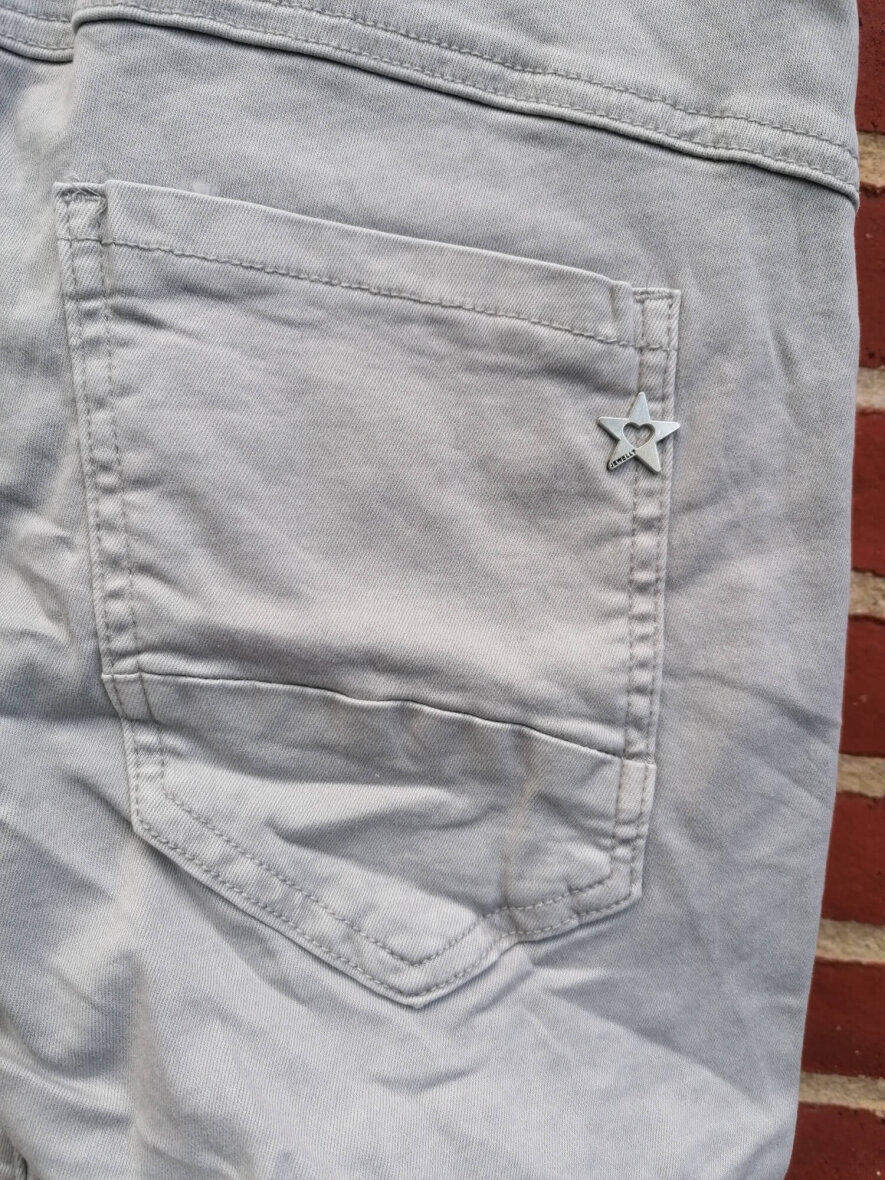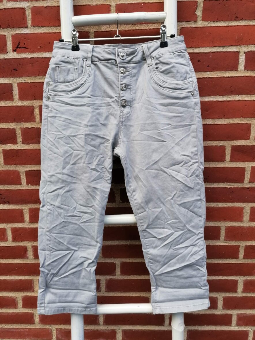 Super flotte lysegrå jeans fra Marta du Chateau. PC2390-15 Jewelly Baggy Jeans er smarte knickers til kvinder. En buks med fine detaljer såsom bling-bling knapper og flotte stikninger ved lommerne. Buksen har lidt stræk i sig. Buksen har et "rynket" design hvilket giver et fedt look.