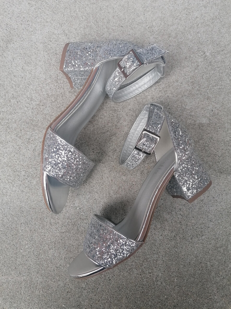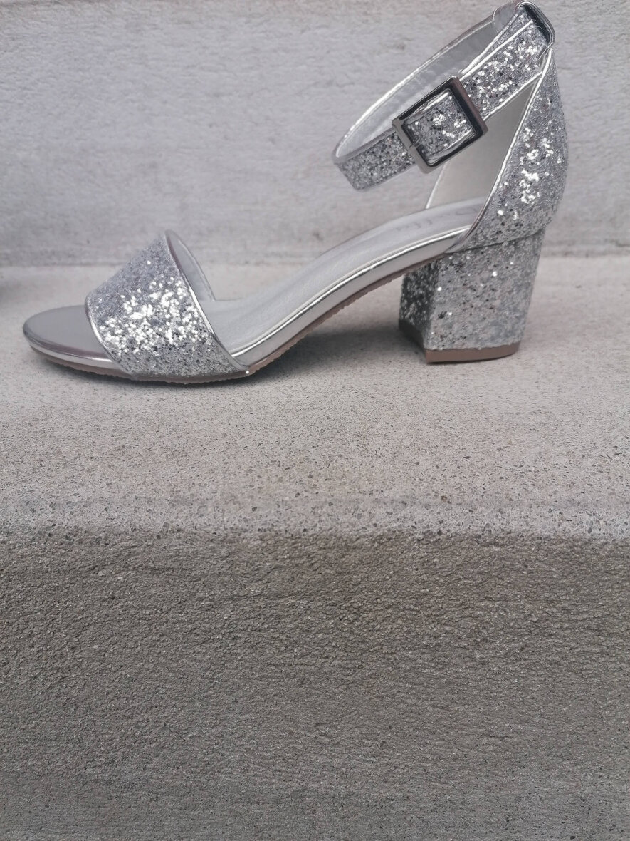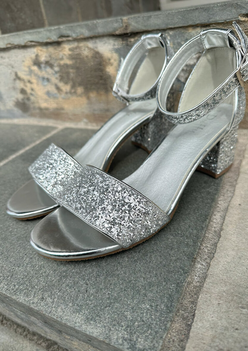 Sandalen har et flot blikfang med de iøjefaldende sølv glimmer pailetter, som giver et fedt look til sandalen.