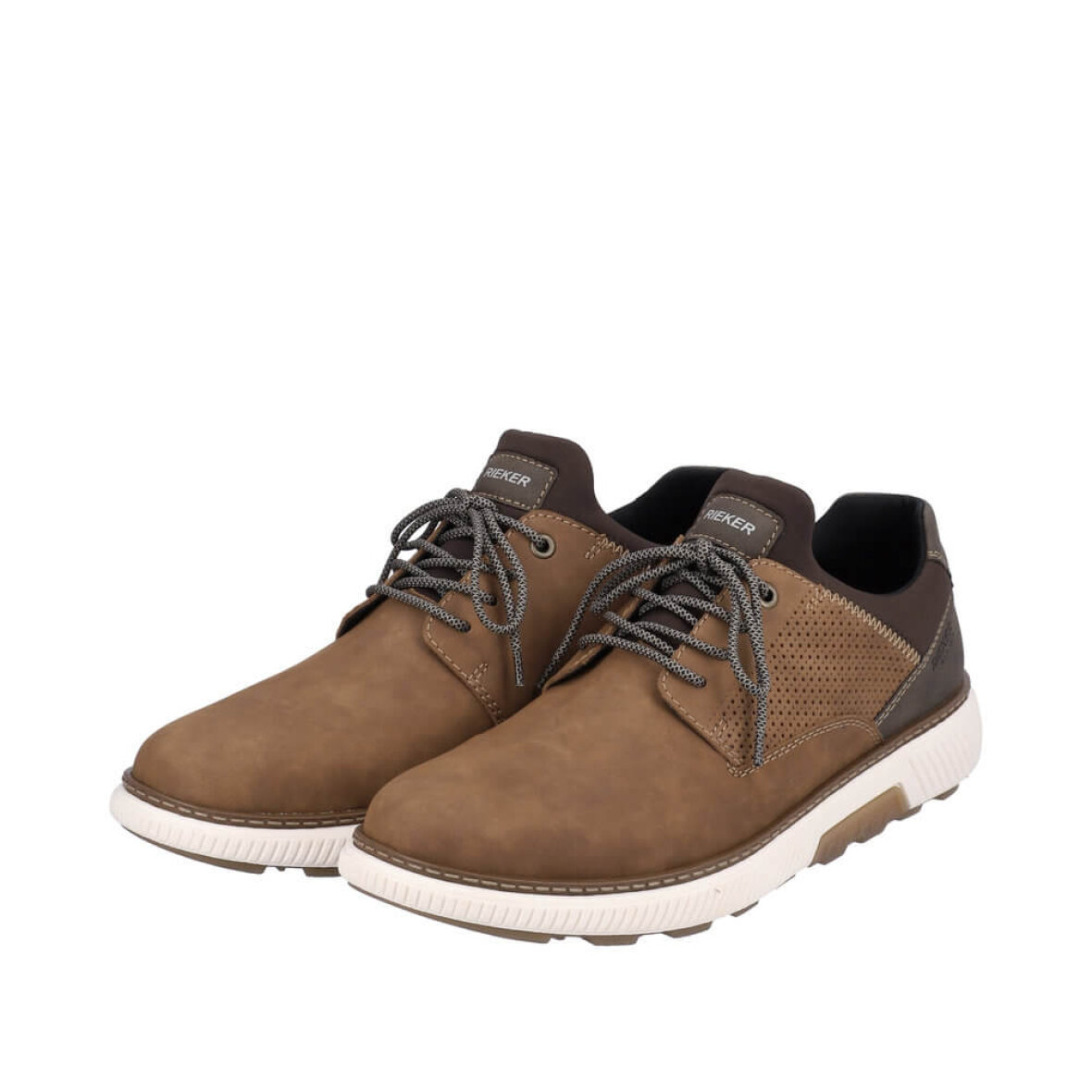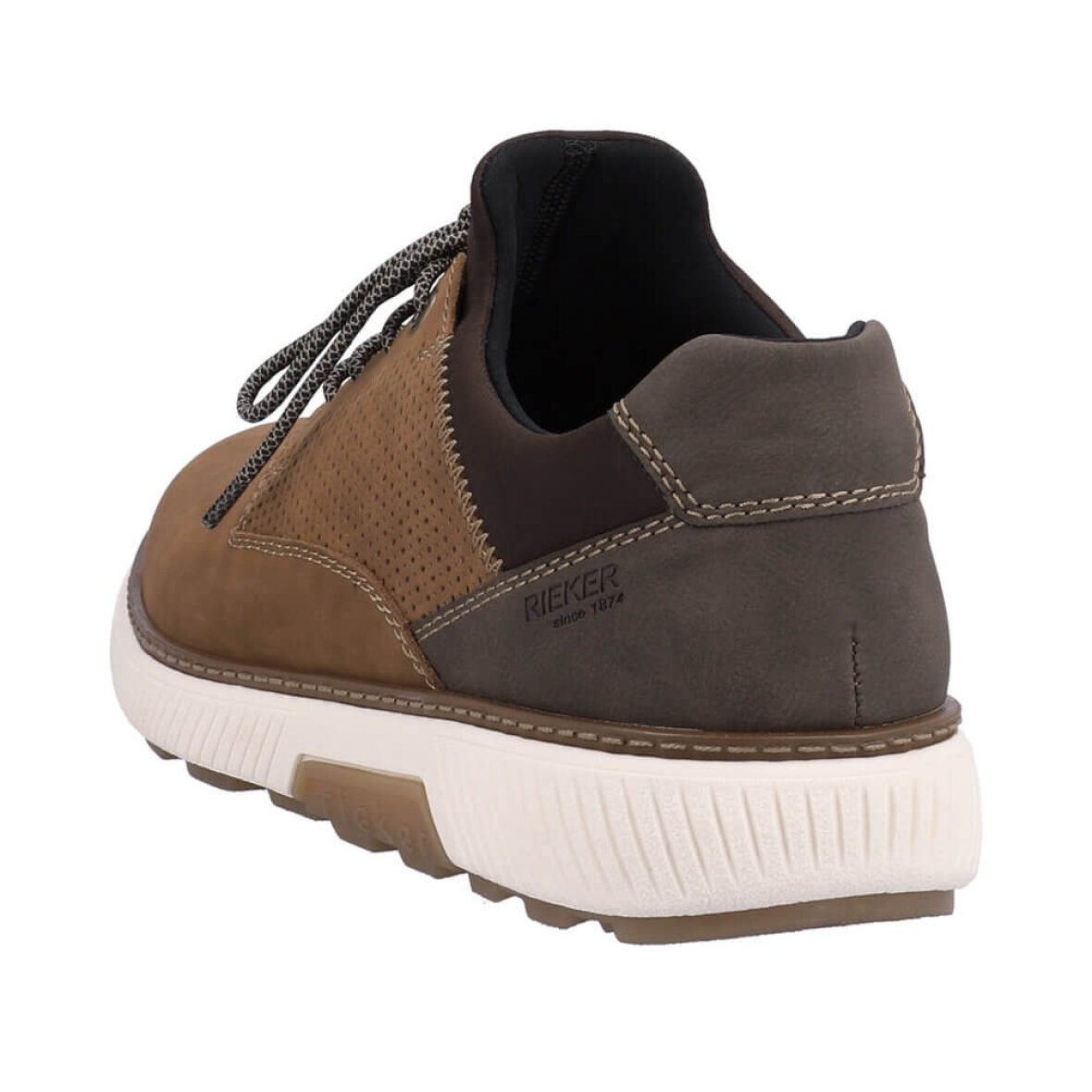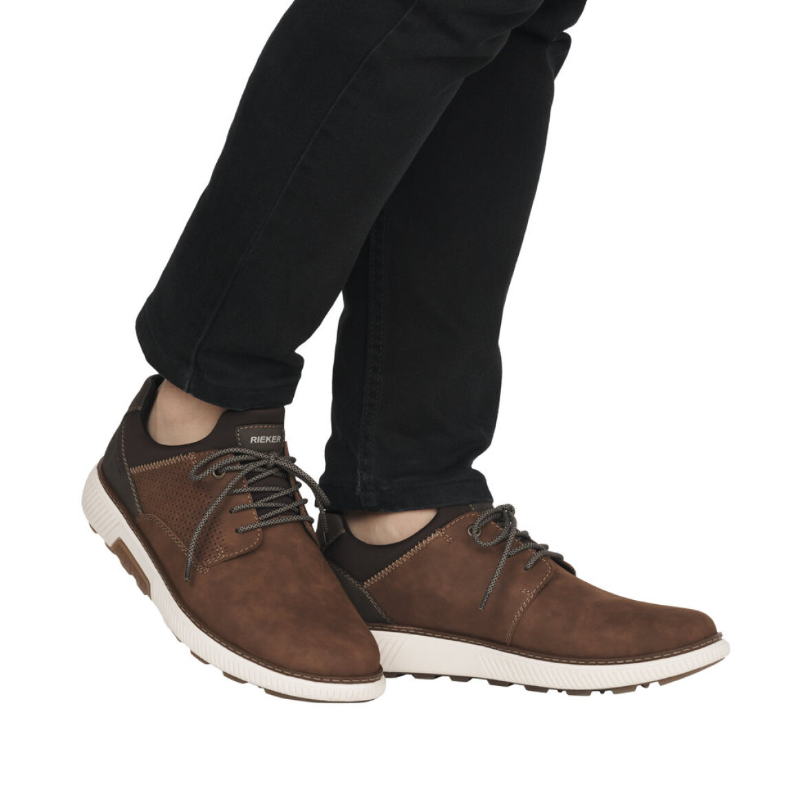 Komfortabel brun herre sneaker fra Rieker. Skoen er lavet i en kombination af skind og syntetisk materiale på overdelen. Skoen har flotte detaljer med mørke elementer i hælen, hullet design på ydersiden og brune stikninger, hvilket giver skoen et fedt look.