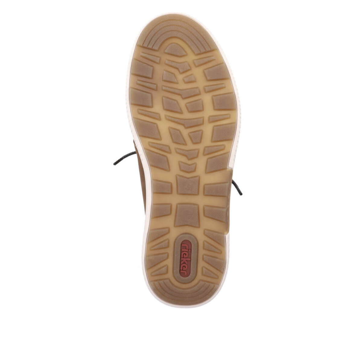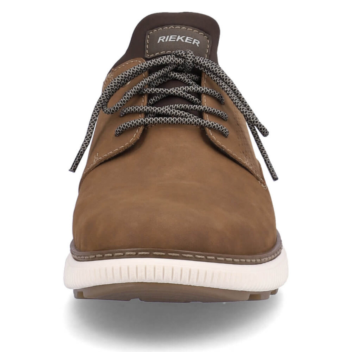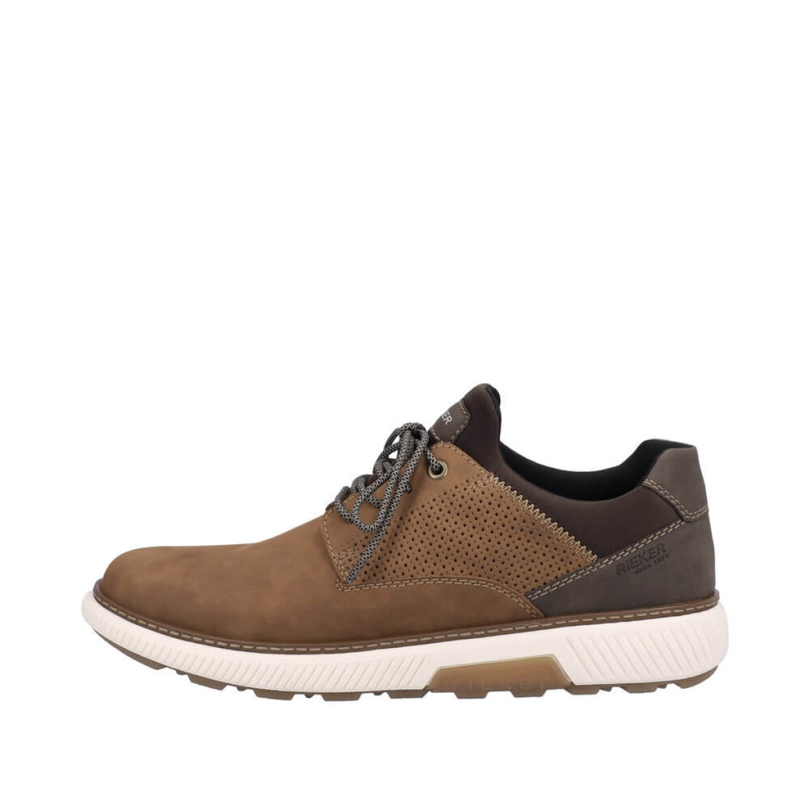 Komfortabel brun herre sneaker fra Rieker. Skoen er lavet i en kombination af skind og syntetisk materiale på overdelen. Skoen har flotte detaljer med mørke elementer i hælen, hullet design på ydersiden og brune stikninger, hvilket giver skoen et fedt look.