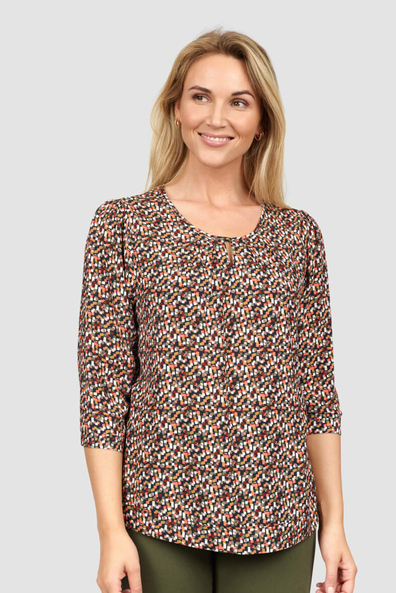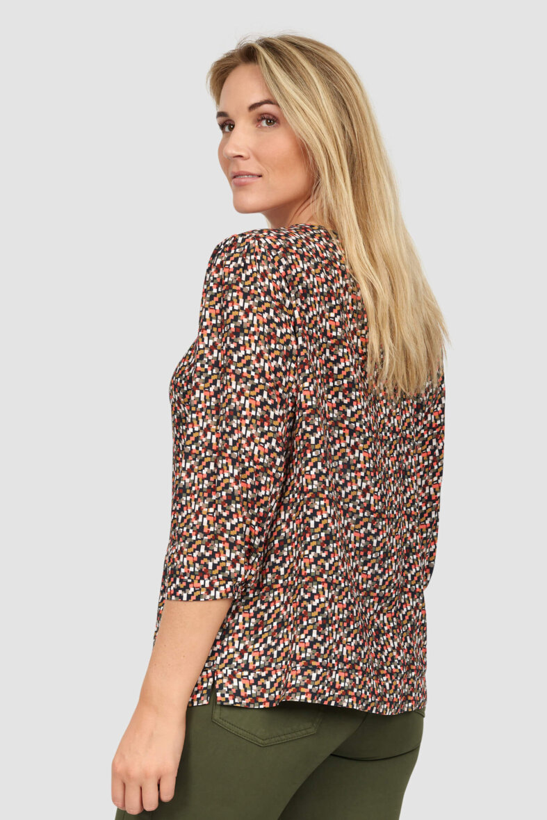 Super fin bluse fra 2-Biz- Blusen er lavet i et smukt geometrisk print med små firkanter i et flot mix af farver. Blusen er med rund hals med en fin lille nøglehuls detalje. Blusen er med 3/4 lange ærmer.