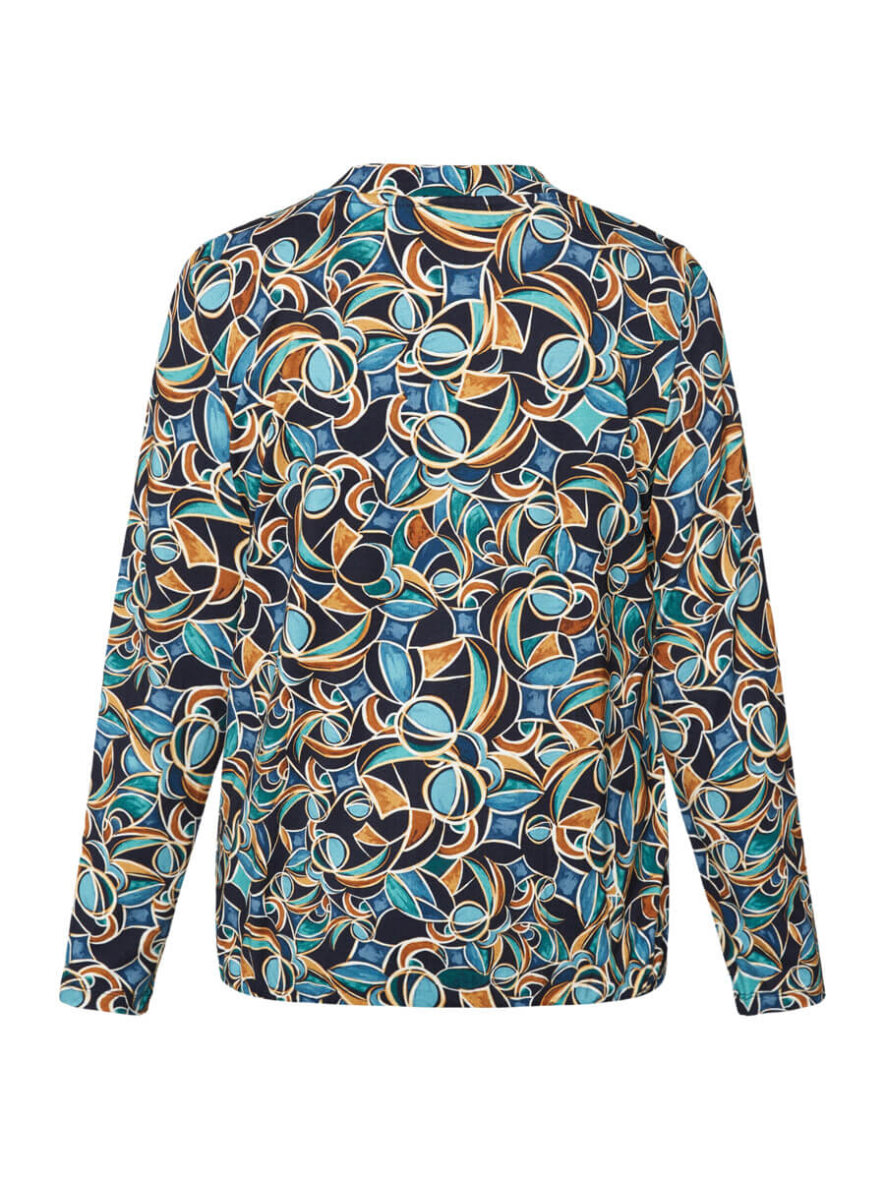 Super flot bluse fra Signature i et smukt grafisk print. Blusen er V-halsudskæring og lange ærmer. Blusen er med elastik kant forneden, hvilket gør at blusen sidder smukt til om taljen og falder løst nederst.