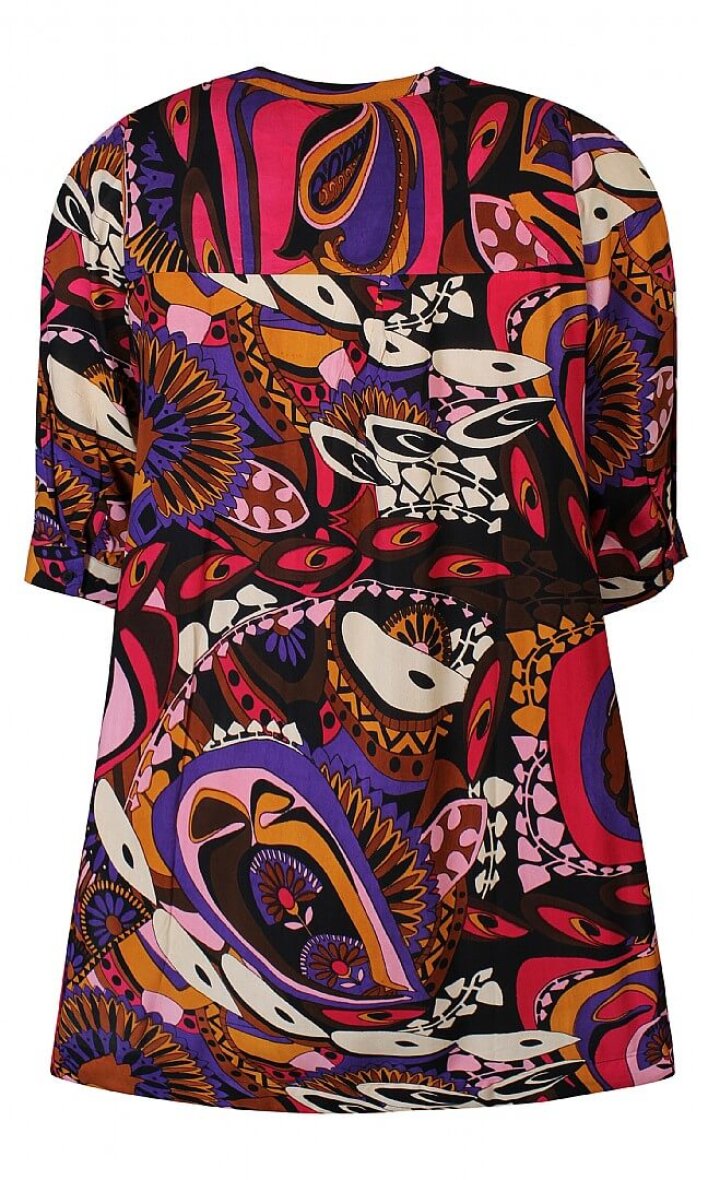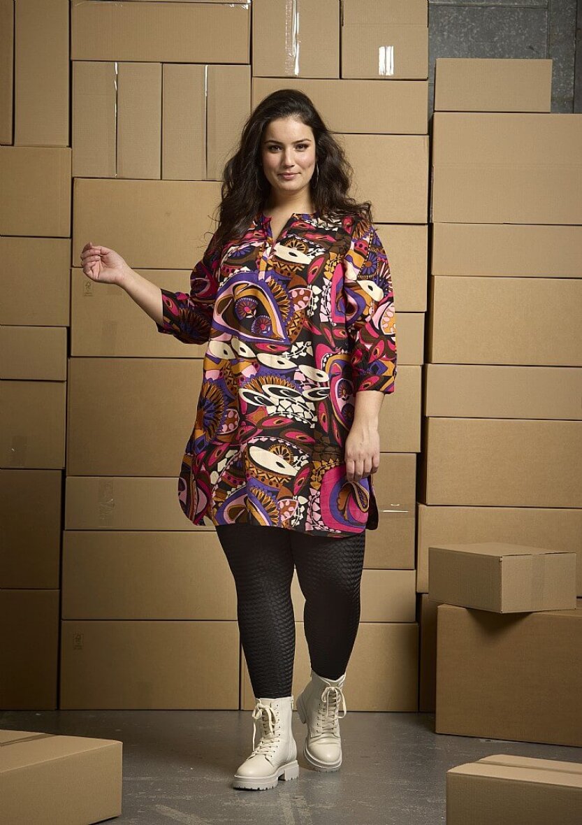 Denne farverige tunika kan bruges til både hverdag og fint brug. Style evt. med et par jeans og blazer i samme lilla toner som på selve tunikaen for et top smart og farverigt look.