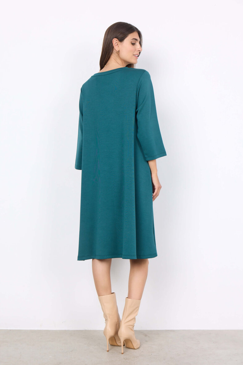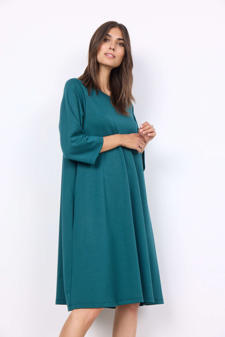 Super flot og enkel grøn kjole fra Soyaconcept. Kjolen er med rund hals og brede 3/4 lange ærmer. Kjolen er lavet i skøn kombination af materialer, som gør den lækker blød og behagelig at have på. Kjolen er med skjulte lommer i siderne.