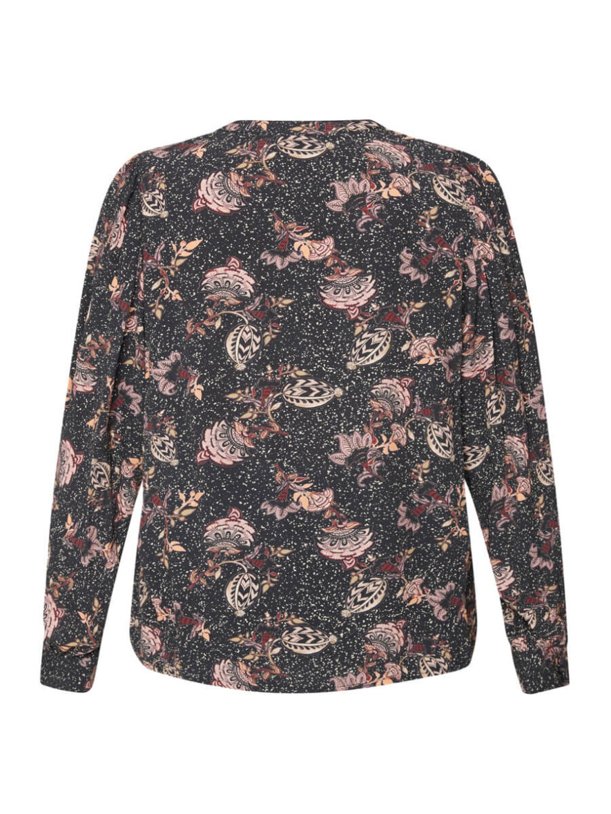 Blusen har rund hals med knapper på fronten. Blusen er med lange ærmer med knapluk på ærmet.