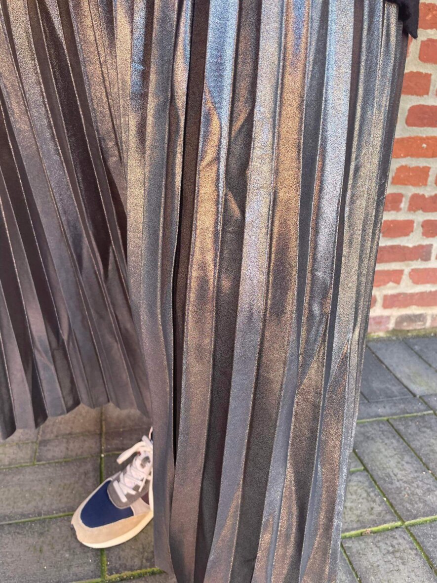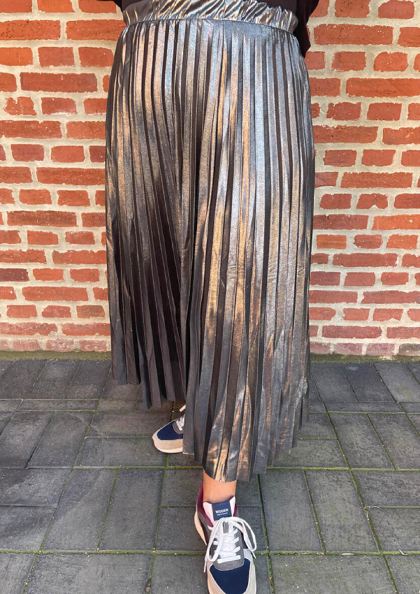 Smuk lang nederdel i en sort/sølv metallic farve fra ONLY Carmakoma. Nederdelen er med plissé og elastik i taljen, så den sidder flot til i taljen.