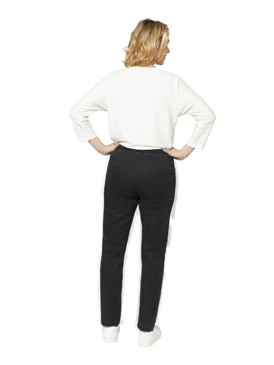 Smarte sorte bukser fra Brandtex. Buksen er med elastik i taljen og stræk i materialet, så den sidder flot til på kroppen. Buksen er med åbne forlommer.