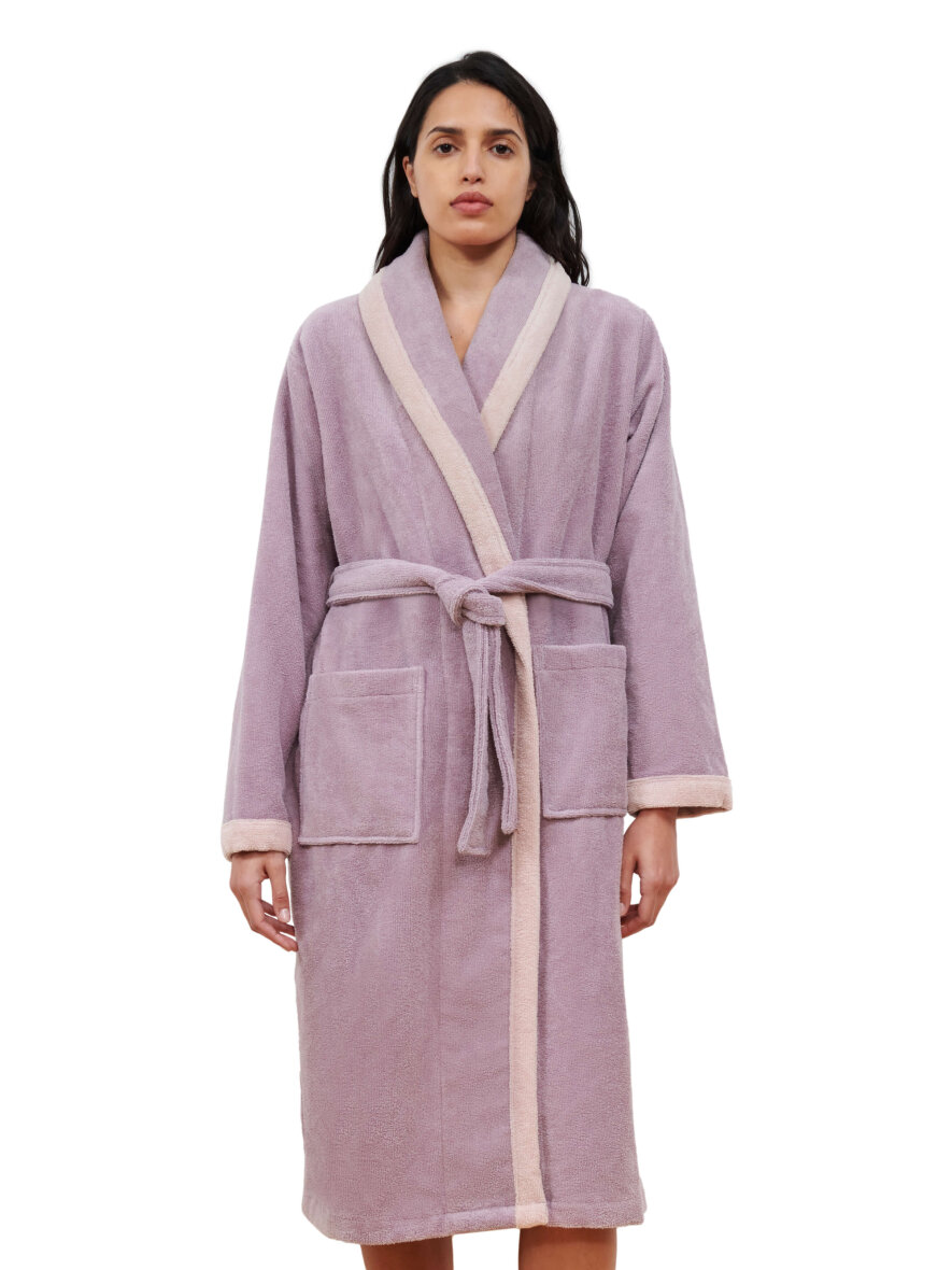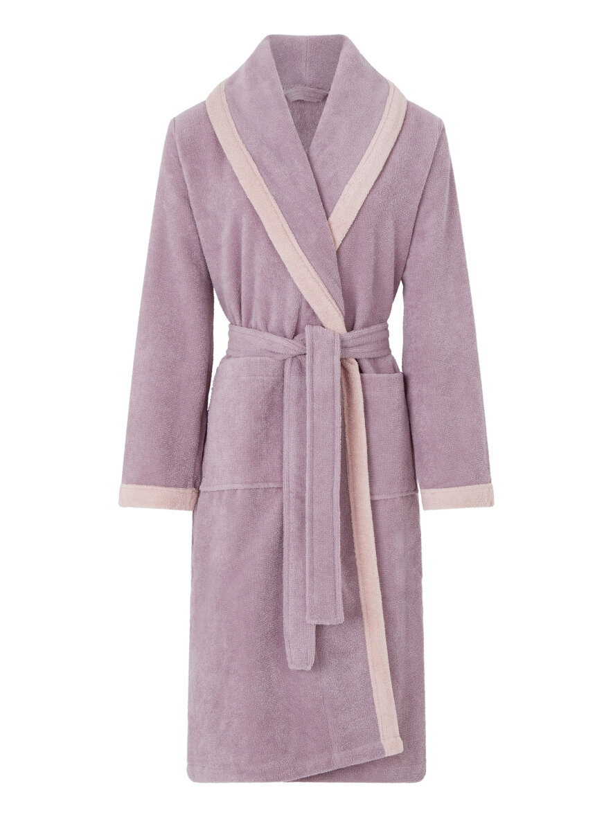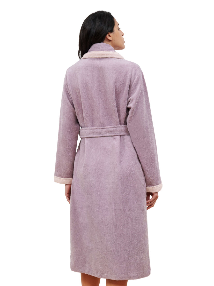 Dejlig blød og lækker morgenkåbe fra Femilet. Den flotte lilla morgenkåbe er med en fin rosa kant langs åbningen og ærmekanten.